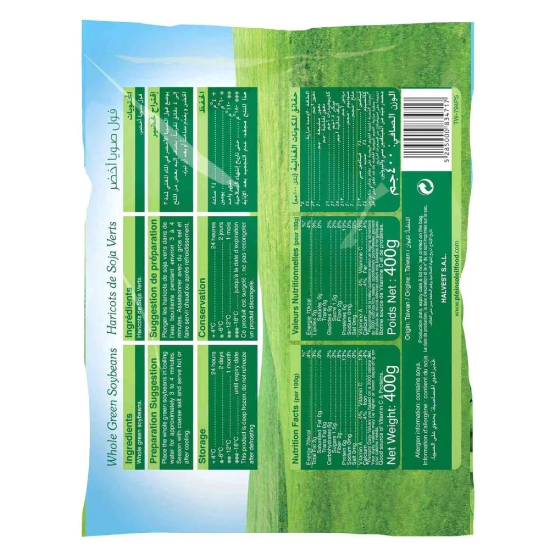 فول الصويا الأخضر الكامل من الأدامامي بلين سولي هو خيار لذيذ ومغذي للوجبات الخفيفة. يتميز فول الصويا هذا بإحتوائه على بروتينات وألياف وفيتامينات ومعادن أساسية. يمكن تناولها بمفردها كوجبة خفيفة صحية أو إضافتها إلى السلطات والأطباق المقلية والأطباق الأخرى لزيادة القيمة الغذائية. يتم مصادرة فول الصويا الأخضر الكامل من مزارع عالية الجودة وتتم حصادها ومعالجتها بعناية لضمان نضارتها ونكهتها. كما أنها خالية من أي إضافات صناعية أو مواد حافظة، مما يجعلها خيارًا طبيعيًا وصحيًا. سواء كنت تبحث عن وجبة خفيفة سريعة وسهلة أو مكون متعدد الاستخدامات لوصفاتك المفضلة، فإن فول الصويا الأخضر الكامل من الأدامامي بلين سولي هو خيار رائع. بفضل لونها الأخضر الزاهي ونسيجها الطري، فإن فول الصويا أدامامي ليس فقط لذيذًا ولكنه أيضًا جذاب بصرياً. يمكن أن تضيف لمسة من اللون إلى أي طبق وتجعله أكثر شهية. سواء كنت نباتيًا، أو تتبع نظام غذائي، أو ببساطة تبحث عن طرق لإضافة المزيد من الأطعمة النباتية إلى نظامك الغذائي، فإن فول الصويا الأخضر الكامل من الأدامامي بلين سولي ليه هو خيار متعدد الاستخدامات ولذيذ يمكن الاستمتاع به بطرق مختلفة.