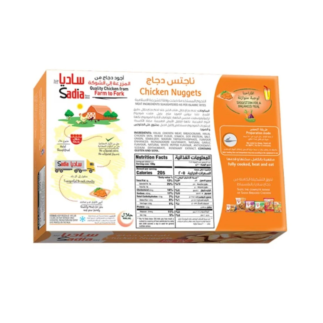 ingredients : لحم الدجاج الحلال (55%)، فتات الخبز، جلد الدجاج الحلال، دهون نباتية، ماء، دقيق القمح، نشاء، بروتين الصويا، ملح، مسحوق البصل المجفف، المثبتات: ترايبوليفوسفات الصوديوم، هيكساميتافوسفات الصوديوم، محسن النكهة: غلوتامات أحادية الصوديوم، نكهة الثوم الطبيعية نكهة الفلفل الأبيض الطبيعي، مضادات الأكسدة: إريثوربات الصوديوم ومستخلص إكليل الجبل.
