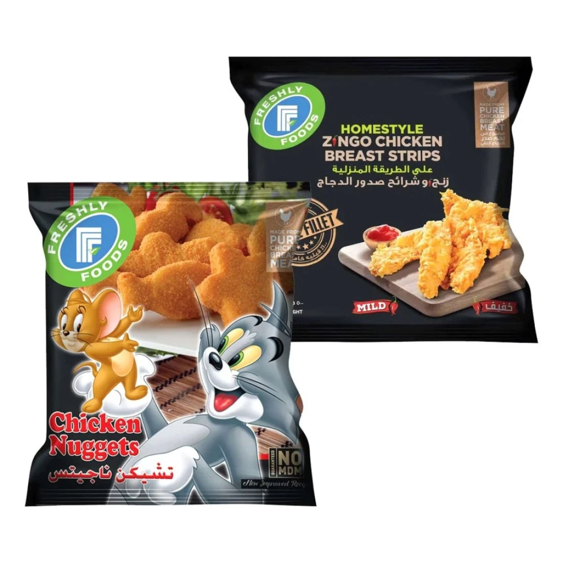 فريشلي فودز زينغو شرائح صدر 500 غرام مع ناغتس الدجاج 750 غرام حزمة من 2