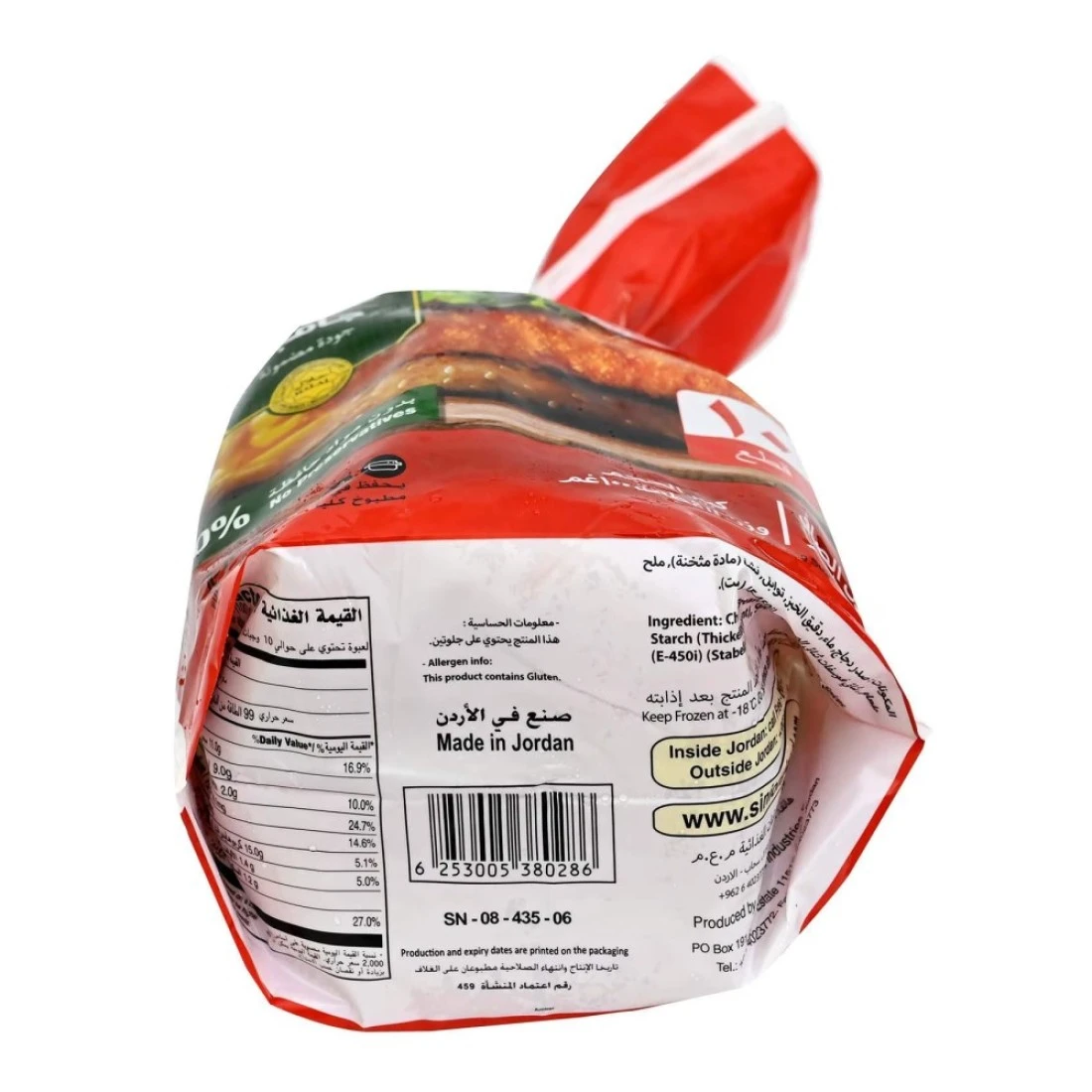 ingredients : لحم بقري مجمد صافي، بروتين الصويا 3% بهارات (ملح، فلفل أسود، فلفل أبيض)، بصل.