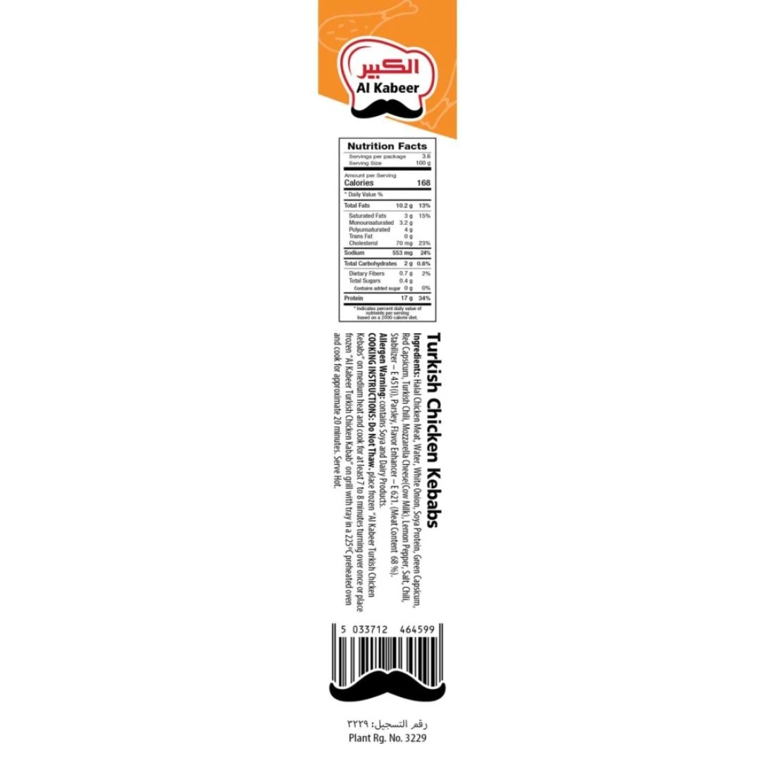 ingredients : لحم دجاج حلال، ماء، بصل أبيض، بروتين الصويا، فلفل أخضر، فلفل أحمر، فلفل تركي، جبنة مودزاريلا، سماق، ملح، فلفل حار، مثبت - E451(i)، بقدونس، محسن نكهة - E621. (محتوى اللحوم 68%).