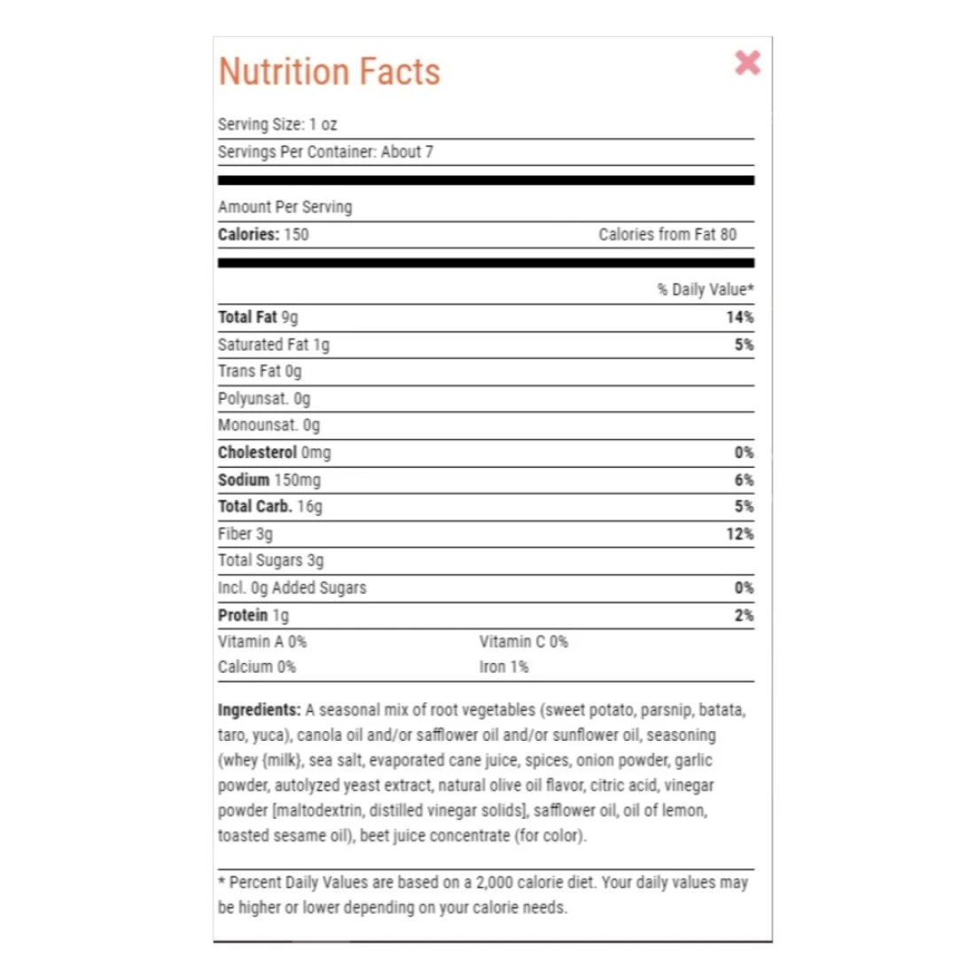ingredients : مزيج من الخضروات الموسمية (قلقاس ، بطاطا حلوة ، بطاطا ، يوكا ، جزر أبيض) ، زيت نباتي صالح للأكل (بذور الكانولا أو بذور القرطم أو بذور عباد الشمس) ، توابل (ملح البحر ، سكر قصب مبخر ، مسحوق بصل ، بهارات ، ثوم مسحوق ، حليب عضوي غير دسم (حليب بقري) ، نكهة طبيعية ، مسحوق خل إيمالتوديكسترين ، خل ، منظم حموضة الستريك) مستخلص الخميرة ، تلوين (مركز عصير البنجر)