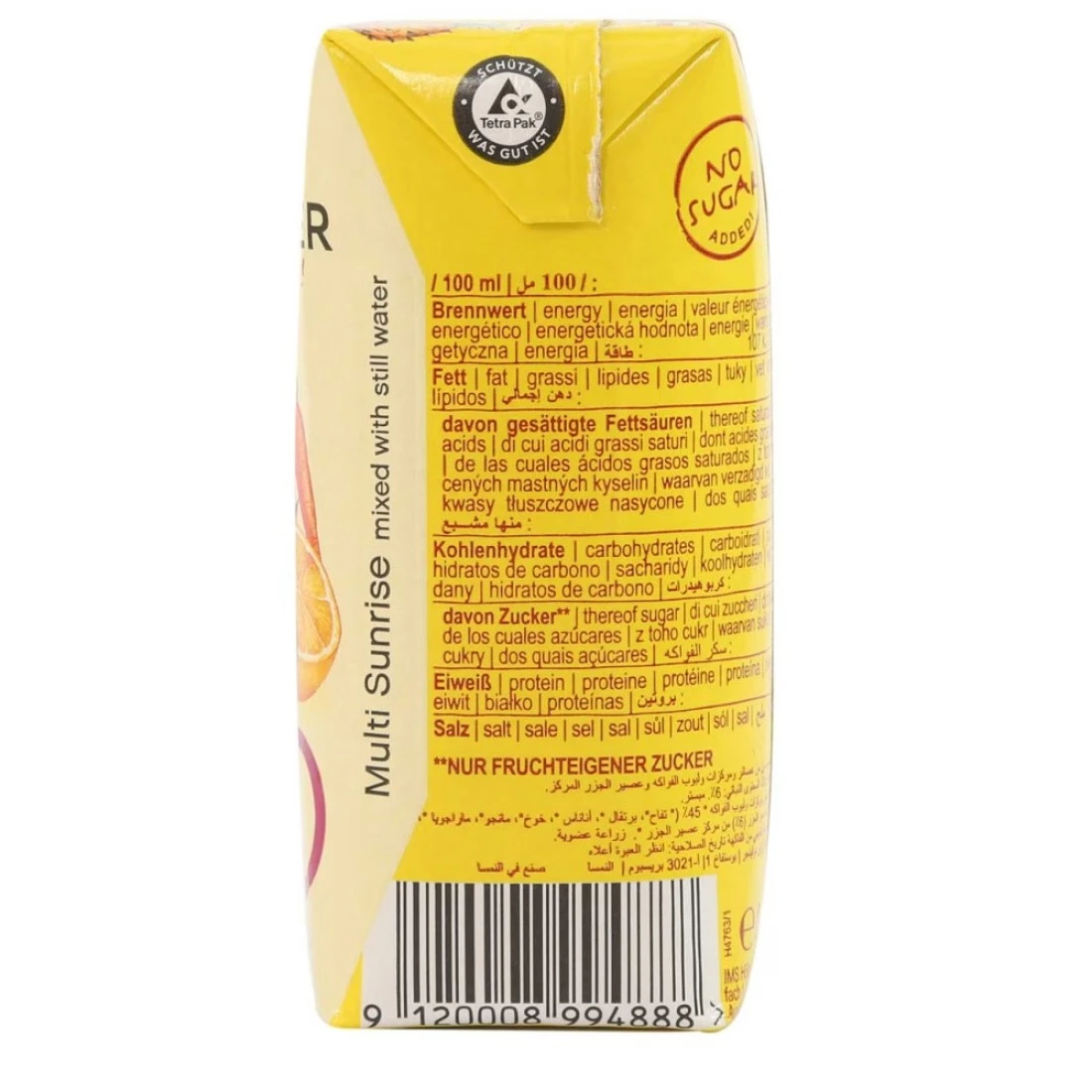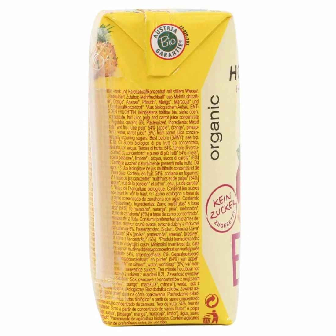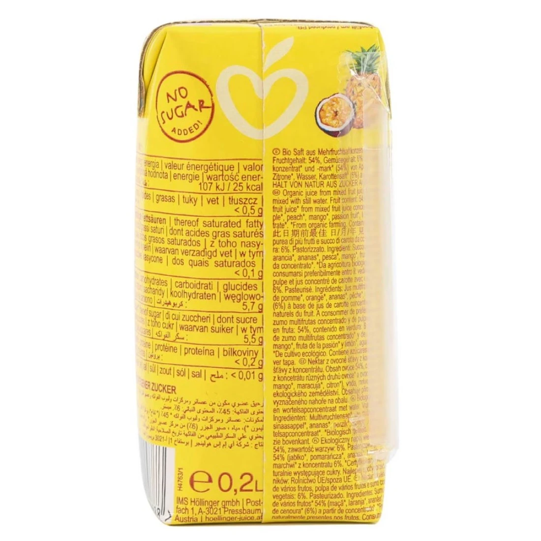 ingredients : عصير فواكه مختلط من تركيز عصير الفواكه المختلط لب عصير الفواكه 54% (تفاح، برتقال، أناناس، خوخ، مانغو، فاكهة الباشن فروت، (ليمون)، ماء، عصير جزر (6%) من تركيز عصير جزر. من الزراعة العضوية. يحتوي على سكريات طبيعية.