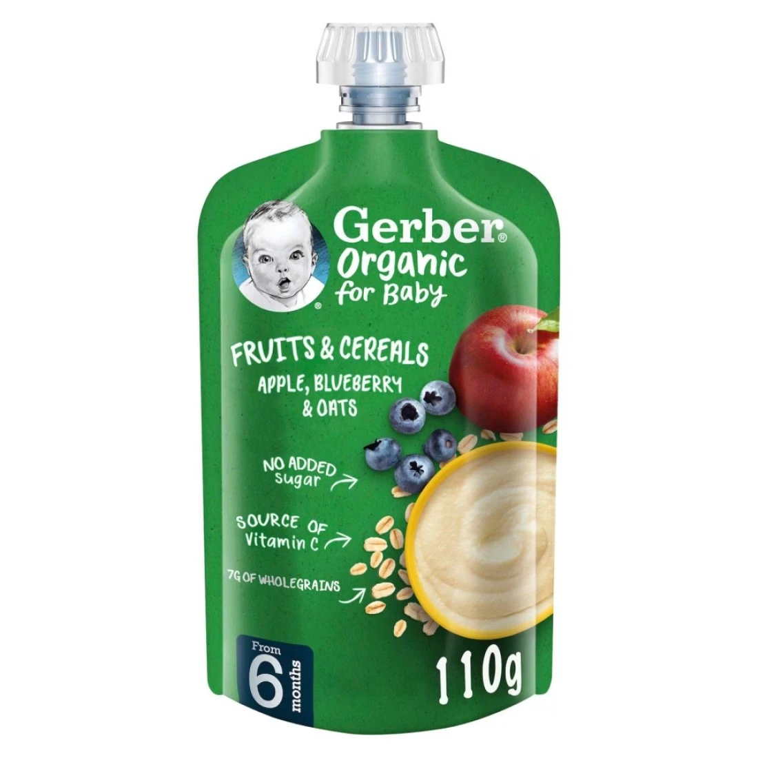 طعام الأطفال العضوي من جيربر، هريس الفواكه والحبوب، التفاح والتوت الأزرق والشوفان، مغذي ولذيذ. مصنوع من التفاح والتوت الأزرق والشوفان العضوي، يزود هذا الهريس الأطفال بالفيتامينات والمعادن والألياف الأساسية. سهل الهضم ومناسب للأطفال من عمر 6 أشهر فما فوق. هذه العبوة العملية، 110 غرام، مثالية للتغذية أثناء التنقل، وخالية من الألوان والنكهات والمواد الحافظة الاصطناعية. قدّم لطفلك وجبة خفيفة لذيذة وصحية مع طعام الأطفال العضوي من جيربر، هريس الفواكه والحبوب، التفاح والتوت الأزرق والشوفان.