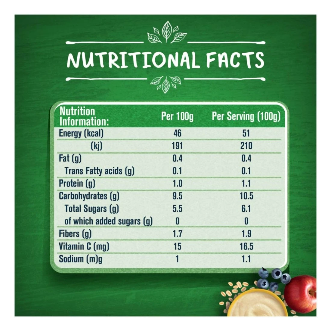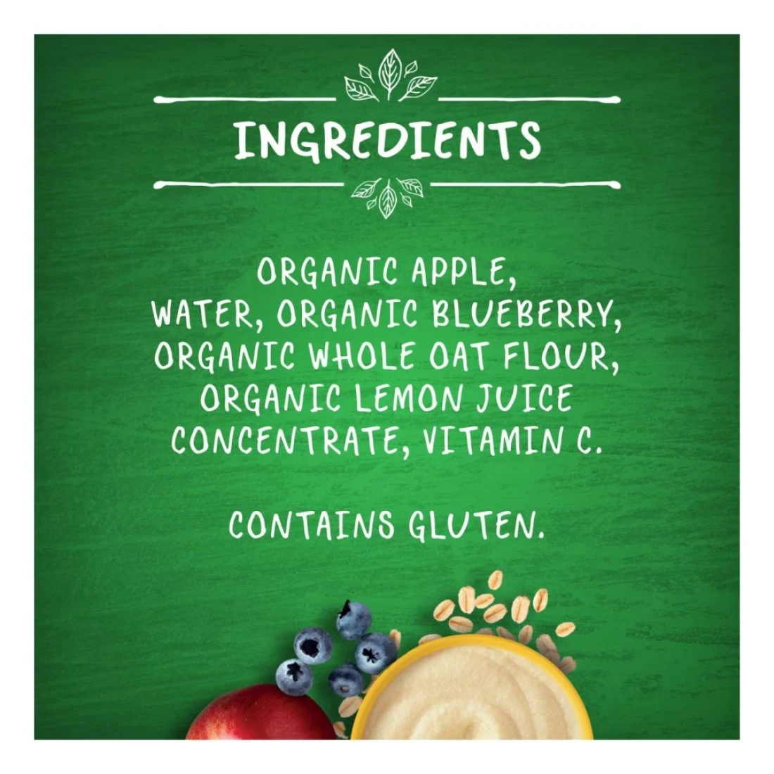 ingredients : تفاح عضوي، ماء، توت أزرق عضوي، دقيق شوفان كامل عضوي، عصير ليمون عضوي، فيتامين سي مركز