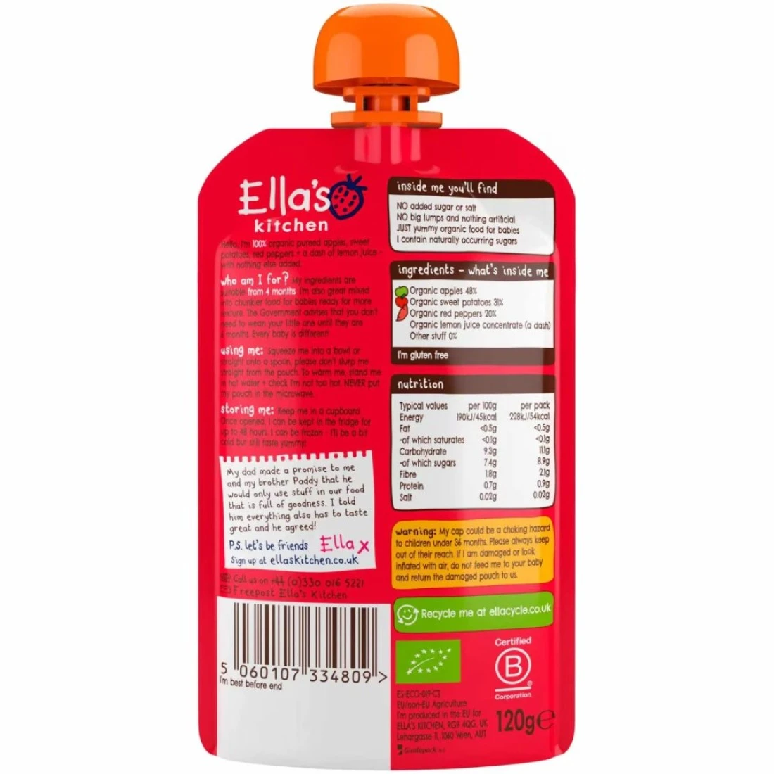 هريس إيلاس كيتشن من الفلفل الأحمر والبطاطس الحلوة والتفاح هو طعام للرضع لذيذ وغني بالعناصر الغذائية مصنوع من الفلفل الأحمر العضوي والبطاطس الحلوة والتفاح. تم تصميمه خصيصًا للرضع الذين تبلغ أعمارهم 4 أشهر فما فوق. الهريس خالٍ من المواد الحافظة والإضافات والسكر المضاف، مما يجعله خيارًا صحيًا لصغيرك. إنه مليء بالفيتامينات والمعادن التي توفر المغذيات الأساسية لدعم نمو وتطور طفلك. تجعل توازن النكهات بين الحلو والمالح هذا الهريس خيارًا لذيذًا وممتعًا لوجبة طفلك. يأتي في كيس مريح بسعة 120 غرامًا، مما يجعله سهل الحمل أثناء التنقل أو لتحضير وجبات سريعة في المنزل.