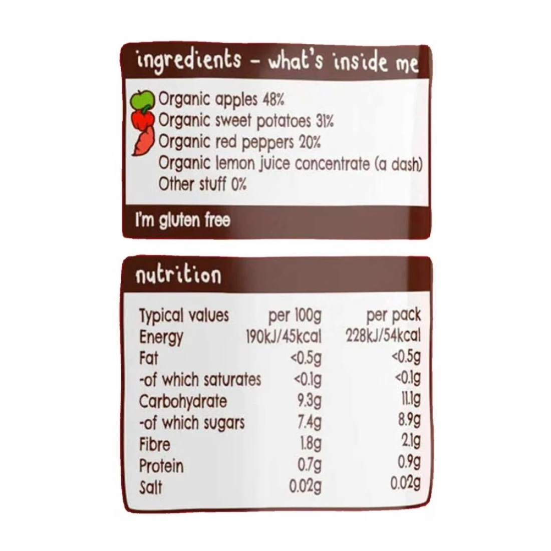 ingredients : 78% تفاح، 11% فلفل أحمر، 11% بطاطا حلوة وعصير ليمون مركز.