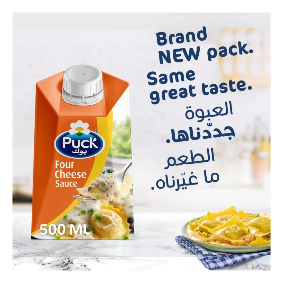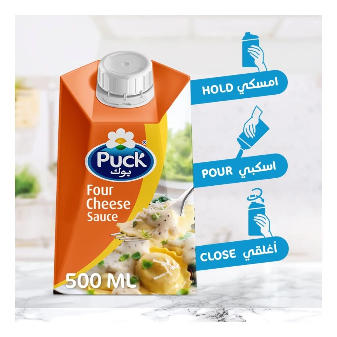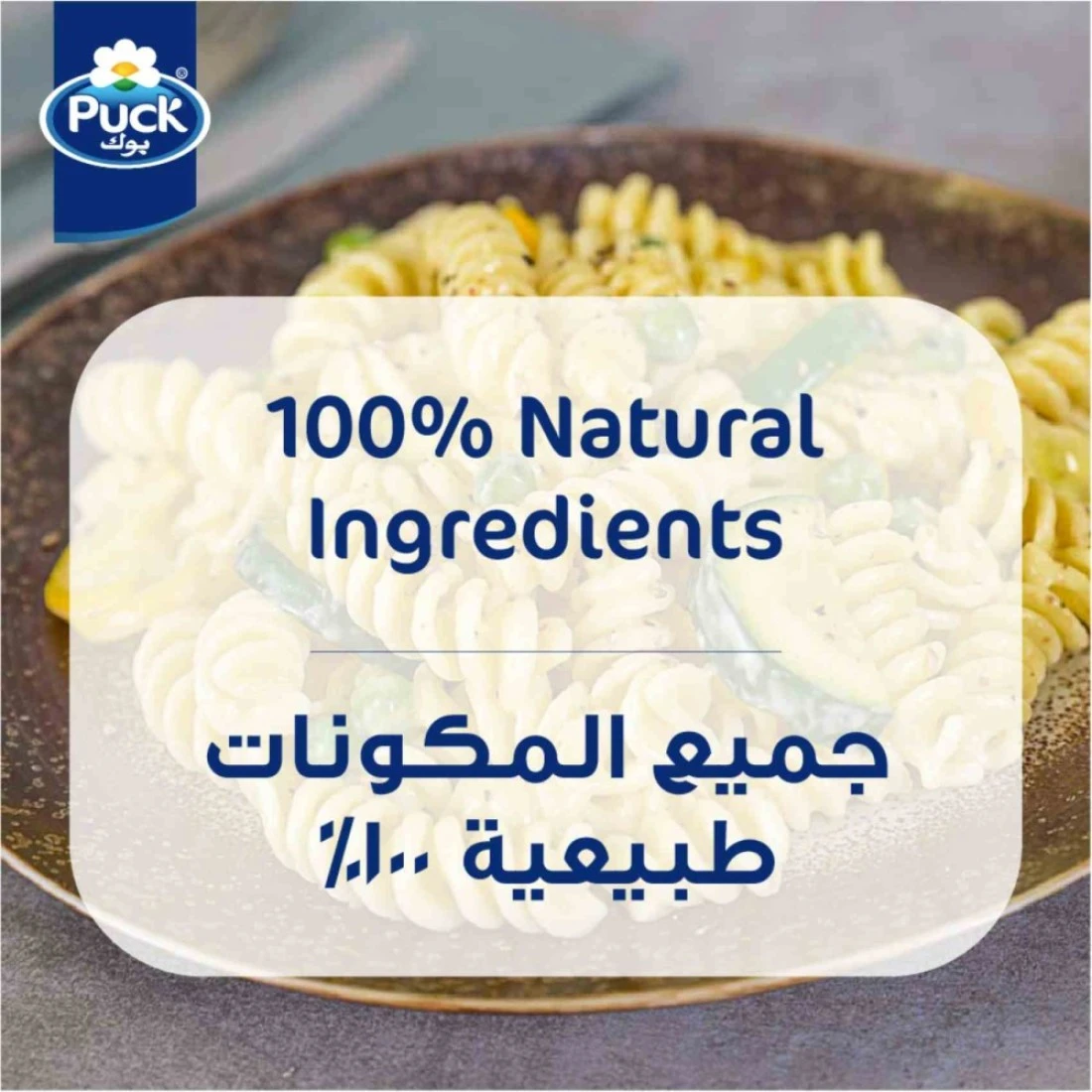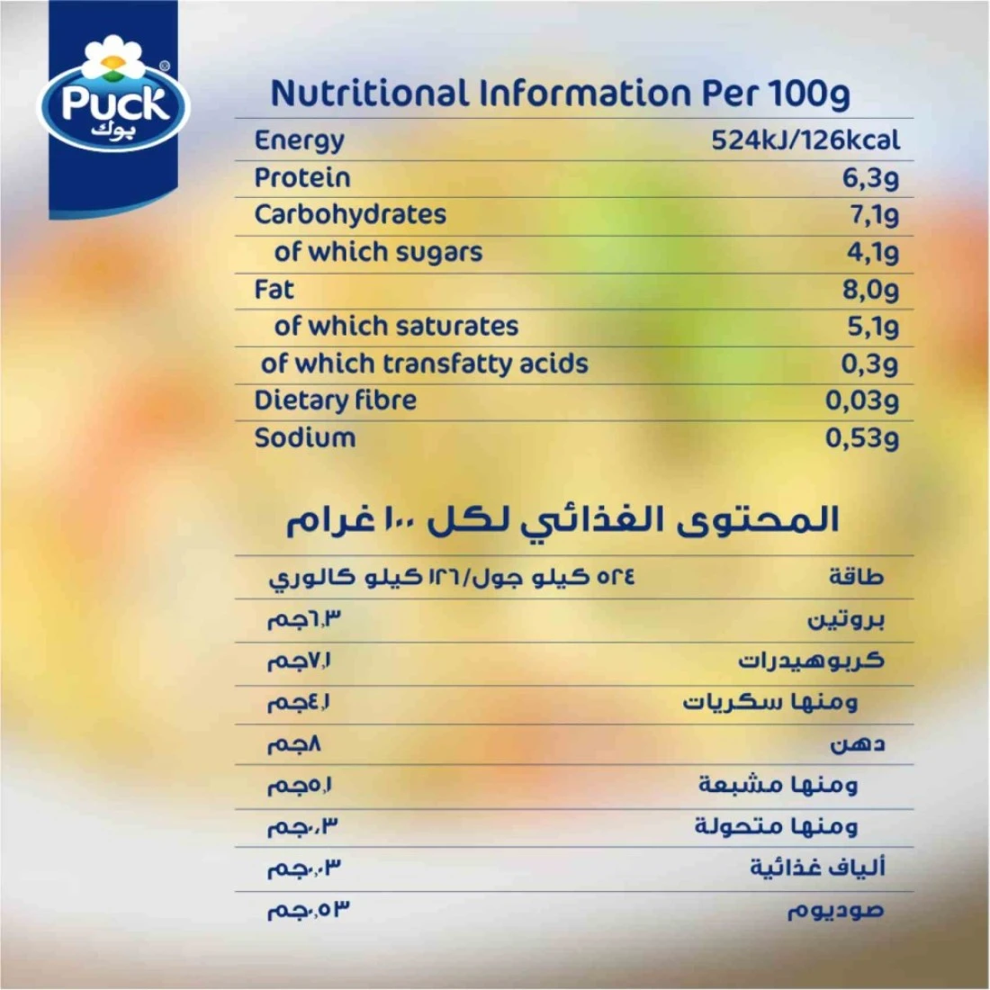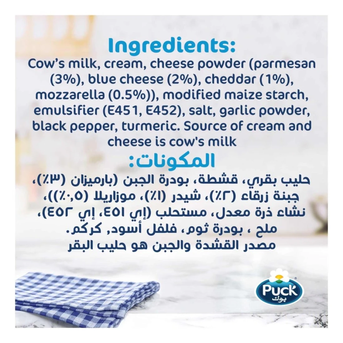 ingredients : كريمة حليب البقر، كريمة، مسحوق الجبن (بارميزان (3%)، جبنة زرقاء (2%)، شيدر (1%)، موزاريلا (0.5%))، (950، نشاء الذرة المعدل، مستحلب (E 451، E 452)، ملح ، ثوم بودرة، فلفل أسود، كركم.