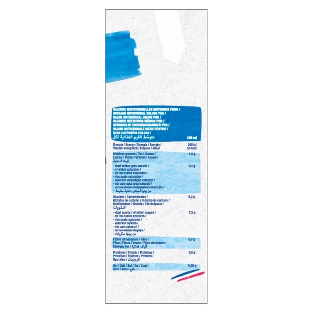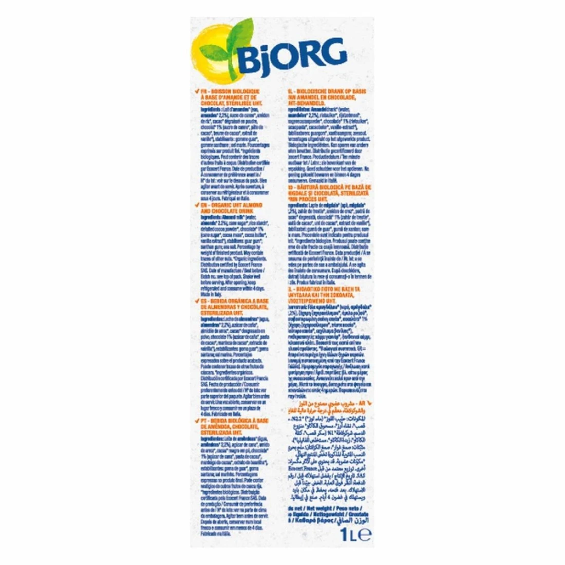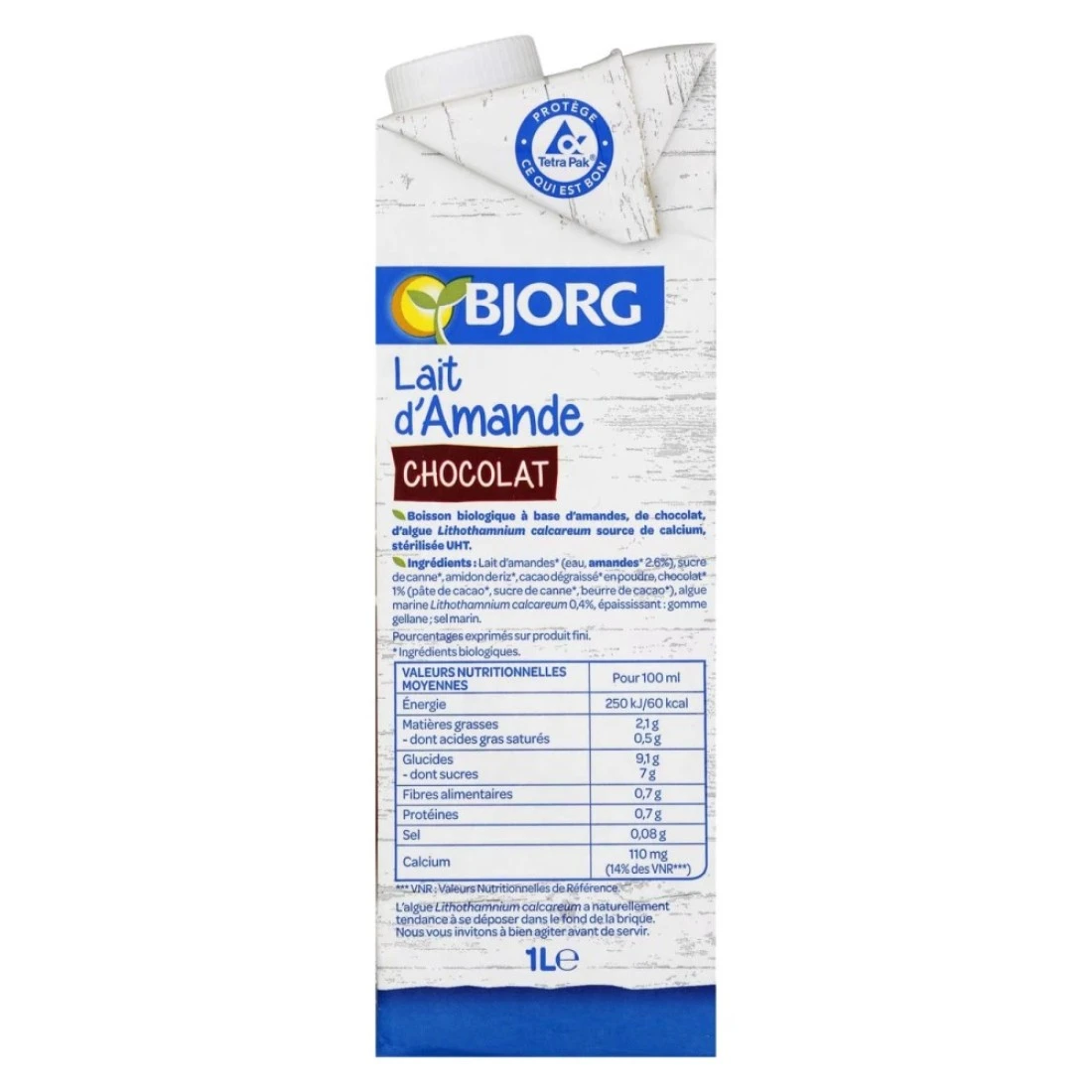 ingredients : حليب اللوز (ماء، لوز 2.2٪)، قصب سكر، نشا غني، مسحوق الكاكاو منزوع الدهن، شوكولاته 1٪ (قصب سكر، كتلة الكاكاو، زبدة الكاكاو، مستخلص الفانيليا)، مثبتات: صمغ الغوار، صمغ الزانثان، ملح بحري.
