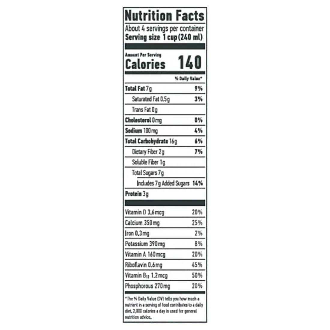 ingredients : ماء، شوفان 10٪، زيت بذور اللفت، معدل حموضة (فوسفات ثنائي البوتاسيوم)، معادن (كربونات الكالسيوم، يوديد البوتاسيوم)، ملح، فيتامينات (د2، ريبوفلافين و ب12)