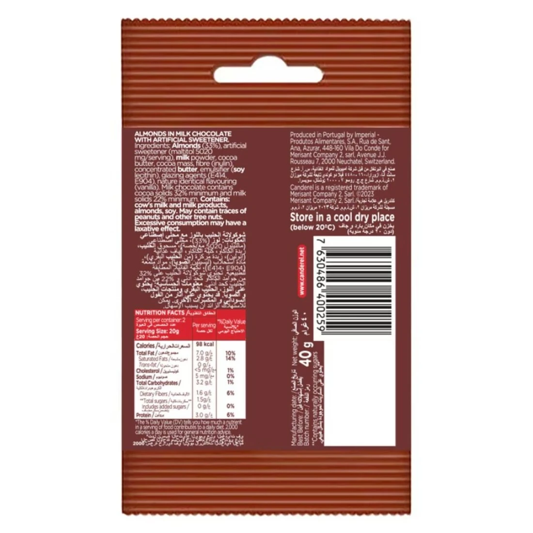 كاندريل لوح شوكولاته بالحليب واللوز بدون سكر مضاف 40 غرام