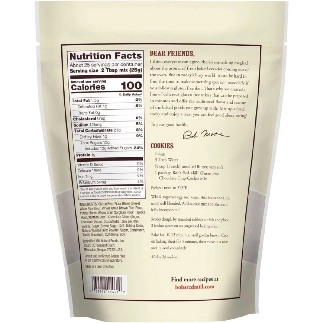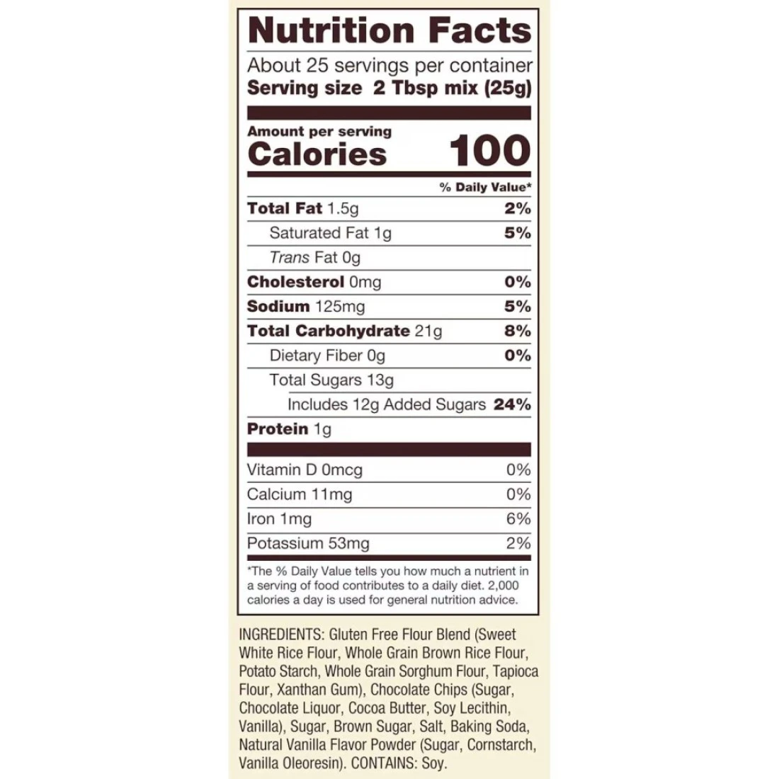 ingredients : مزيج الدقيق الخالي من الجلوتين (دقيق الأرز الأبيض الحلو، دقيق الأرز البني، نشا البطاطس، دقيق الذرة الكاملة، دقيق التابيوكا، صمغ الزانثان)، رقائق الشوكولاتة (السكر، شراب الشوكولاتة، زبدة الكاكاو، ليسيثين الصويا، الفانيليا)، السكر البني، ملح البحر، صودا الخبز، مسحوق نكهة الفانيليا الطبيعية (السكر، نشا الذرة، راتنج الفانيليا).