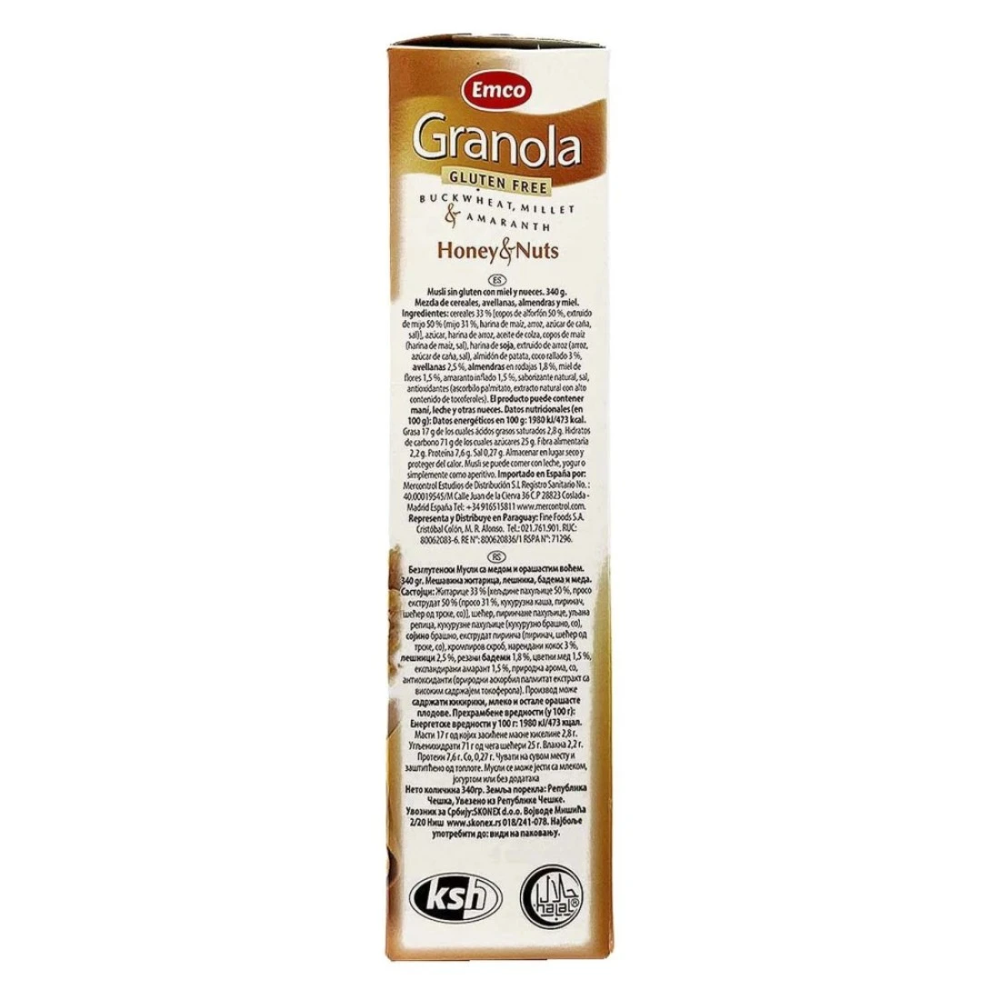 ingredients : حبوب 33٪ [رقائق الحنطة السوداء 50٪ ، دخن مبثوق 50٪ (دخن 31٪ ، دقيق الذرة، أرز، قصب السكر، ملح)]، سكر، دقيق الأرز ، زيت بذور اللفت ، رقائق الذرة (دقيق الذرة ، ملح) ، دقيق الصويا ، أرز مقذوف (أرز ، قصب السكر ، ملح) ، نشاء البطاطس ، جوز هند مبشور 3٪ ، بندق 2،5٪ ، شرائح اللوز 1،8٪ ، عسل الزهر 1،5٪ ، قطيفة منتفخة ، منكهات ، ملح ، مضادات الأكسدة (أسكوربيل بالميتات ، مستخلص طبيعي يحتوي على نسبة عالية من التوكوفيرول).