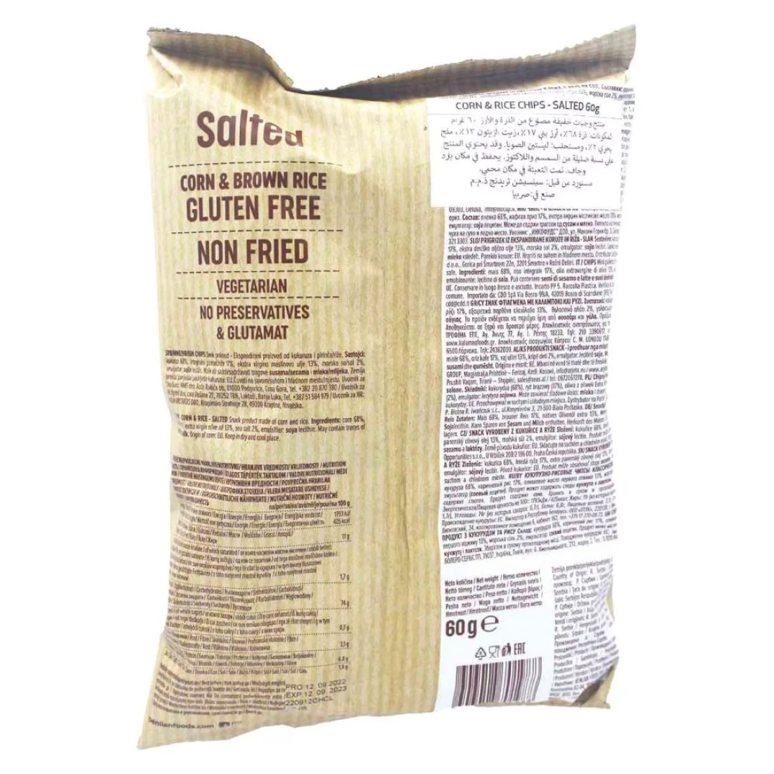 - رقائق الأرز البني والذرة الخالية من الغلوتين والدسم، رفيعة ومقرمشة بشكل مكثف مع عطر طبيعي فواح ومصنوعة بزيت الزيتون دون إضافة مواد حافظة أوألوان صناعية أوزيت النخيل
