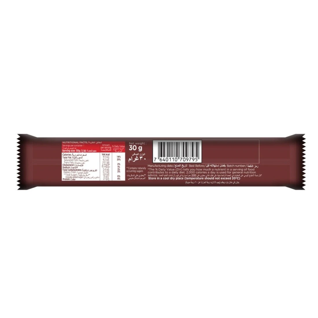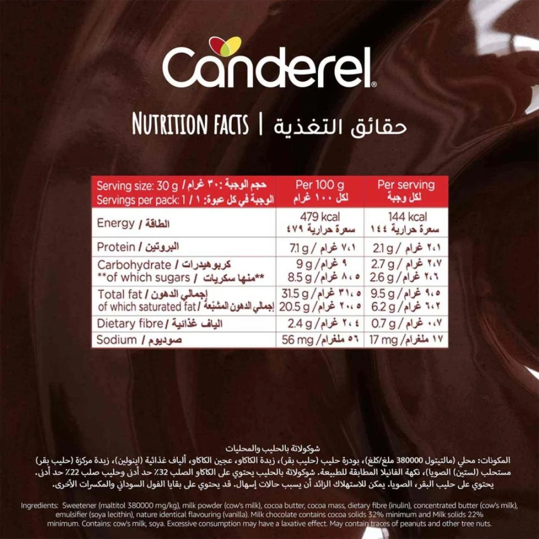 ingredients : شوكولاتة الحليب، محلي (مالتيتول E965-i)، إينولين (ألياف)، مسحوق حليب (حليب بقري)، زبدة كاكاو، كتلة كاكاو، زبدة مركزة (حليب بقري)، مستحلب (ليسيثين الصويا E322)، أسبارتام (محلي غير غذائي) E951) نكهة (الفانيليا) جوامد الكاكاو: 32% جوامد الحليب: 23% كحد أدنى. (قد يحتوي على الفول السوداني والمكسرات الأخرى)