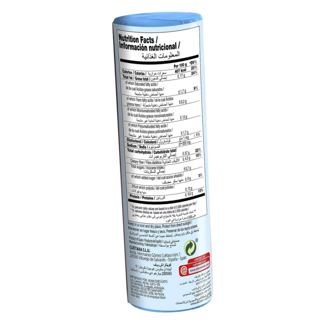 ingredients : دقيق قمح، محليات (شراب مالتيتول، سكرالوز)، زيت نخيل، شراب فروكتوليغوساشاريدس، عوامل رفع (أمونيوم وكربونات الصوديوم)، ملح، خلاصة الشعير.