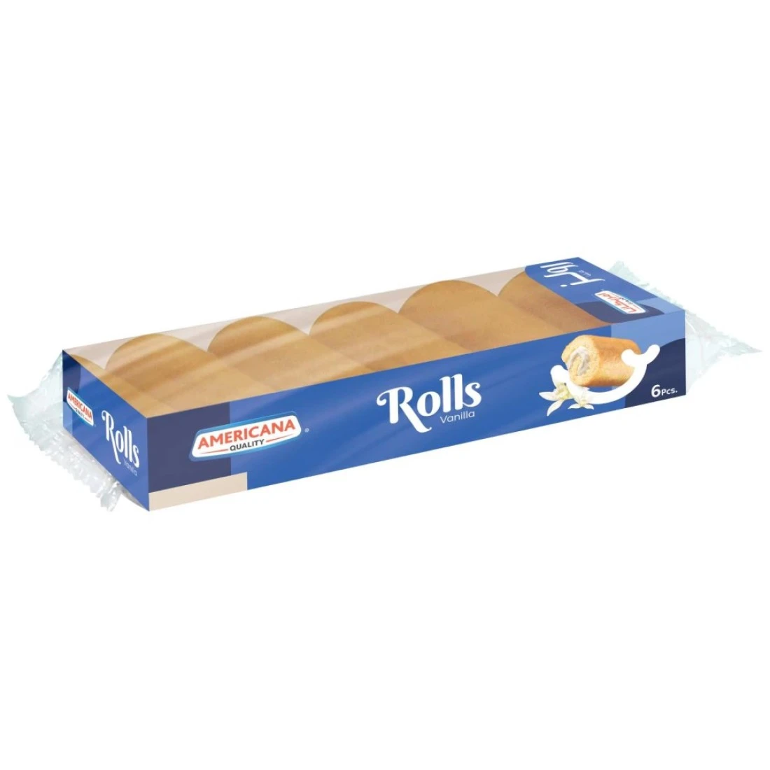 أمريكانا فانيليا رولز كيك هي حلوى لذيذة تتكون من 6 لفات فردية من كعكة الفانيليا الناعمة والرقيقة. كل لفة مليئة بحشوة الفانيليا الكريمية ومغطاة بالشربات الحلو. مثالية لأي مناسبة، من المؤكد أن لفائف الفانيليا هذه سترضي شهيتك للحلوى.