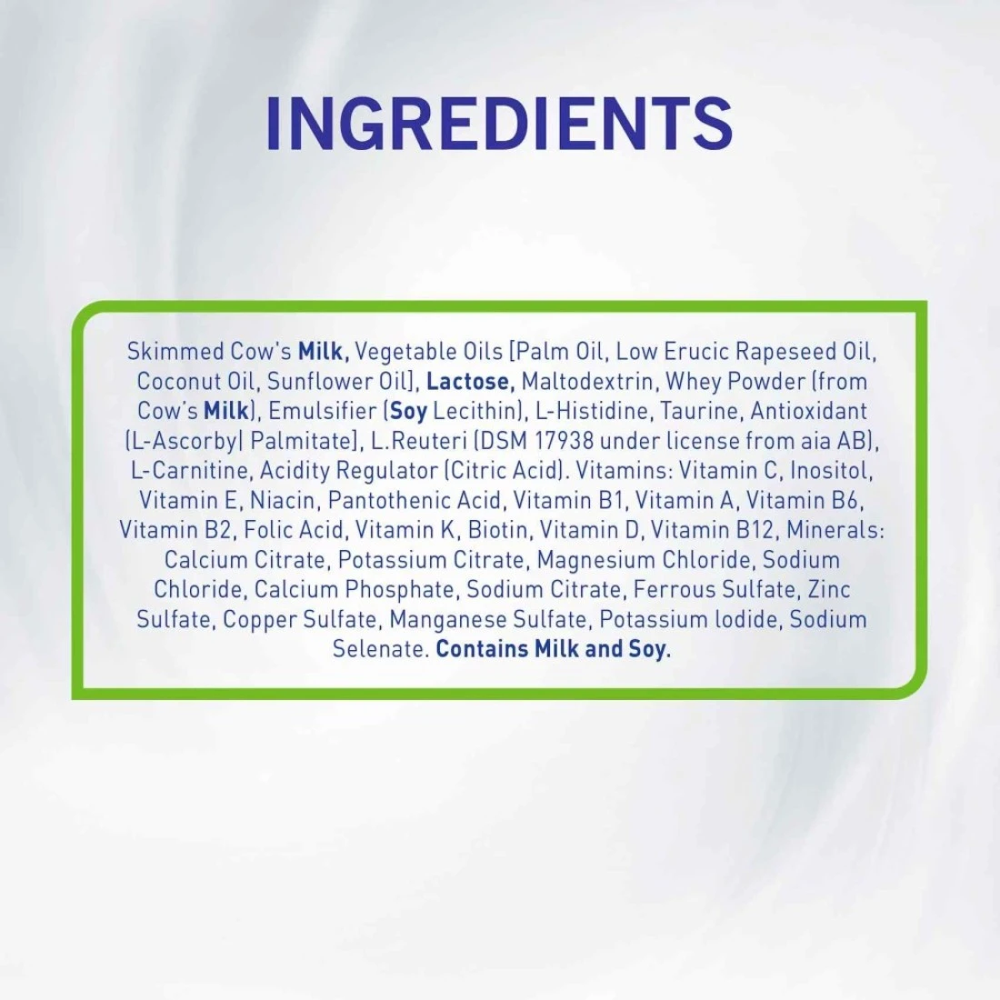 ingredients : حليب البقر منزوع الدسم، لاكتوز، بروتين مصل اللبن، مركّز، زيت النخيل، زيت بذور اللفت، زيت جوز الهند، زيت عباد الشمس، مستحلب، ليسيثين الصويا، إل هيستيدين، تورين إينوزيتول، خمائر اللاكتوباسيلوس، إل كارنيتين، معادن وفيتامينات خمائر اللاكتوباسيلوس