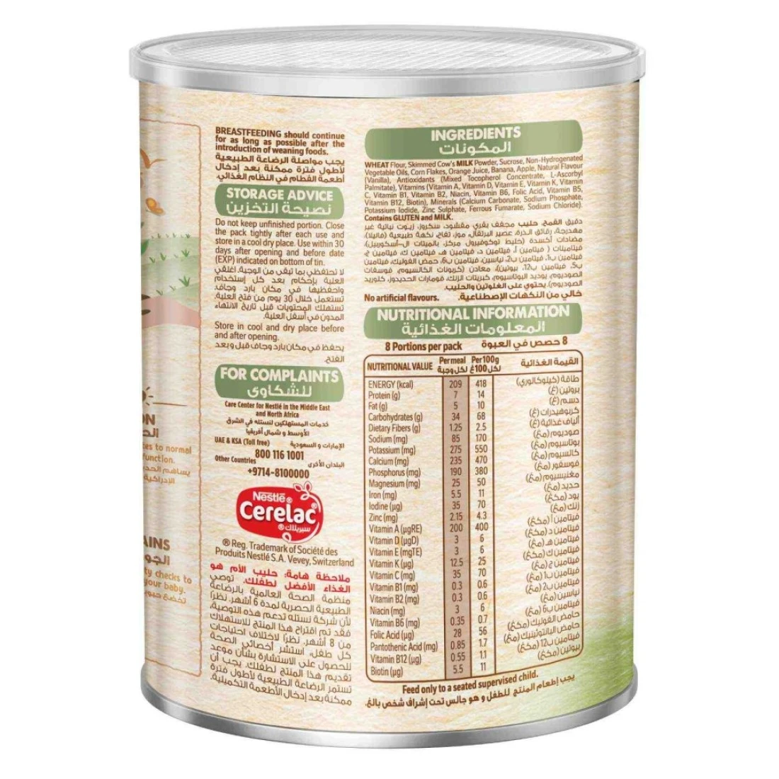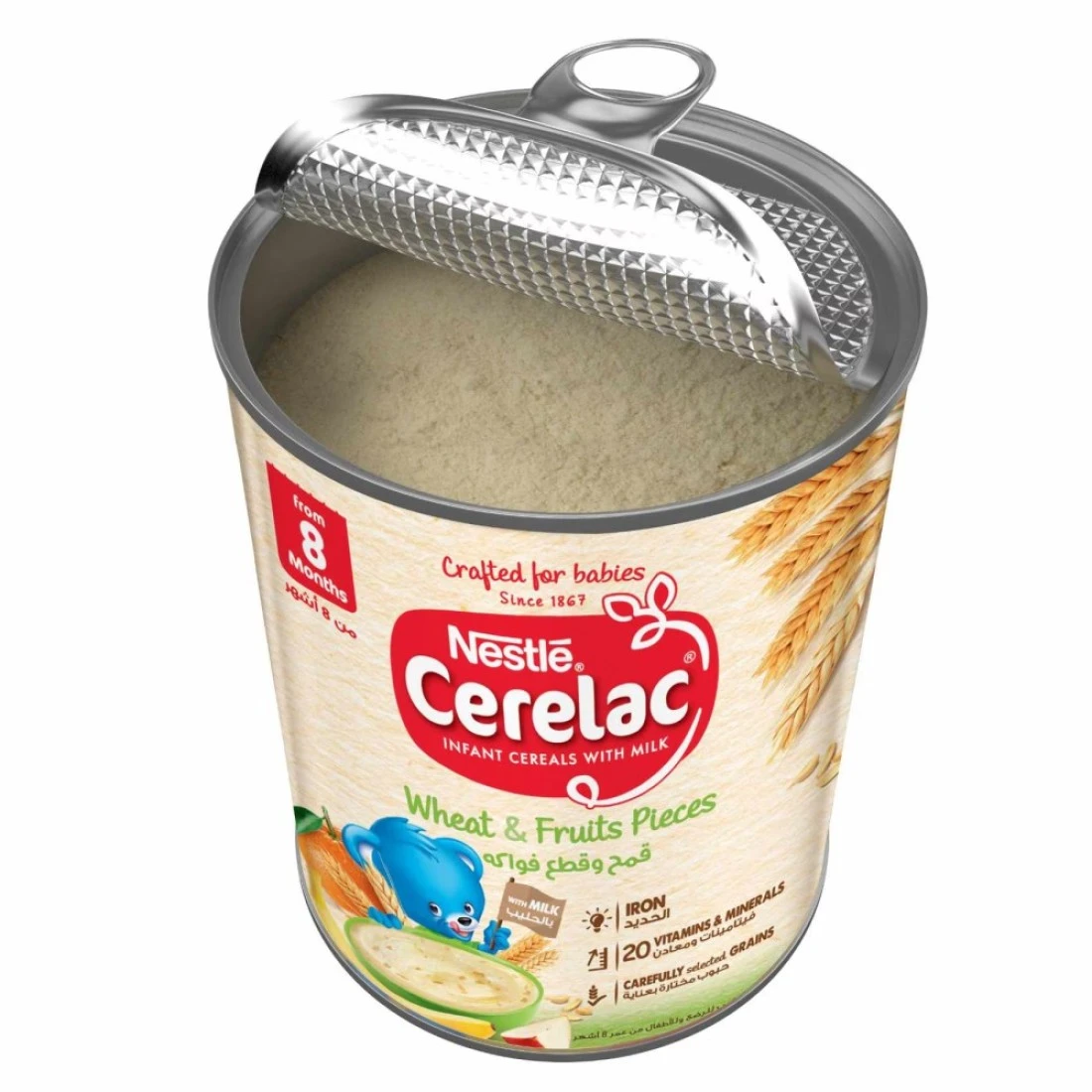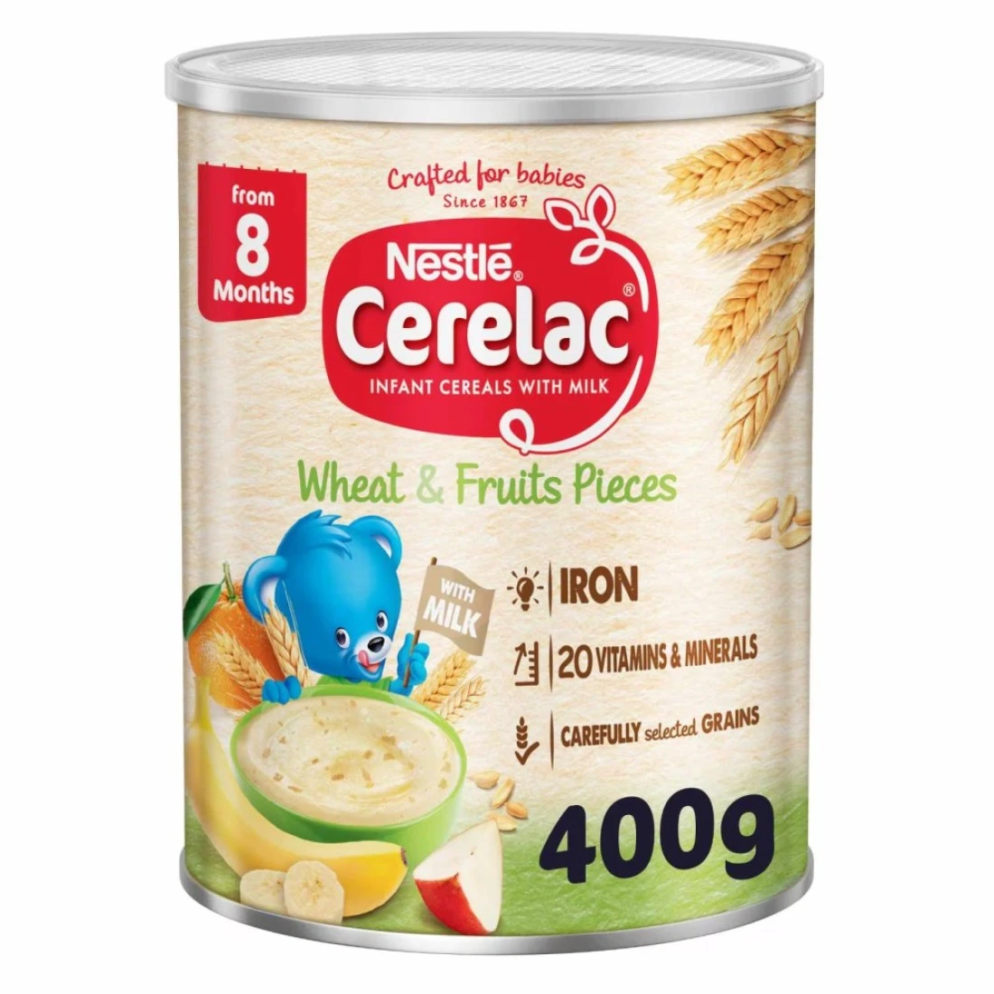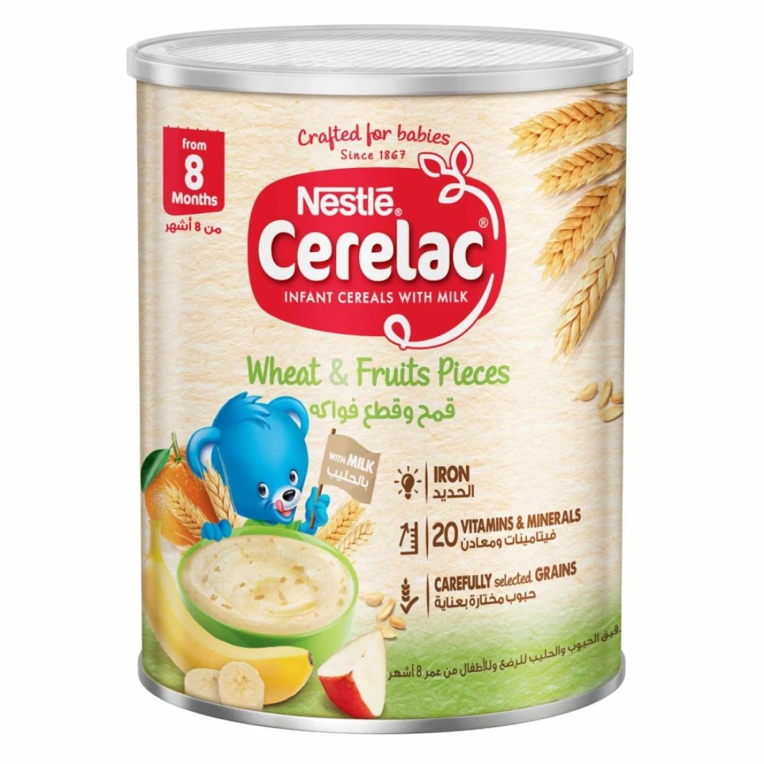 نستله سيريلاك حبوب للرضع بالقمح وقطع الفواكه مع الحليب مدعمة بـ 16 فيتامين ومعدن (بما في ذلك الحديد والكالسيوم وفيتامين D). محضرة بحبوب مختارة بعناية ولا تحتوي على مواد حافظة أو ألوان أو نكهات صناعية. وجبة مصممة خصيصًا للأطفال من عمر 8 أشهر فما فوق.
