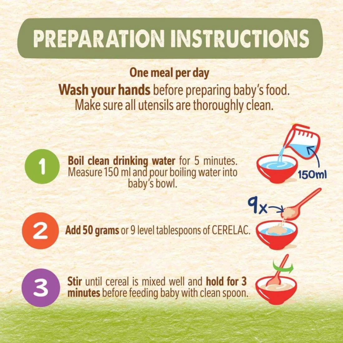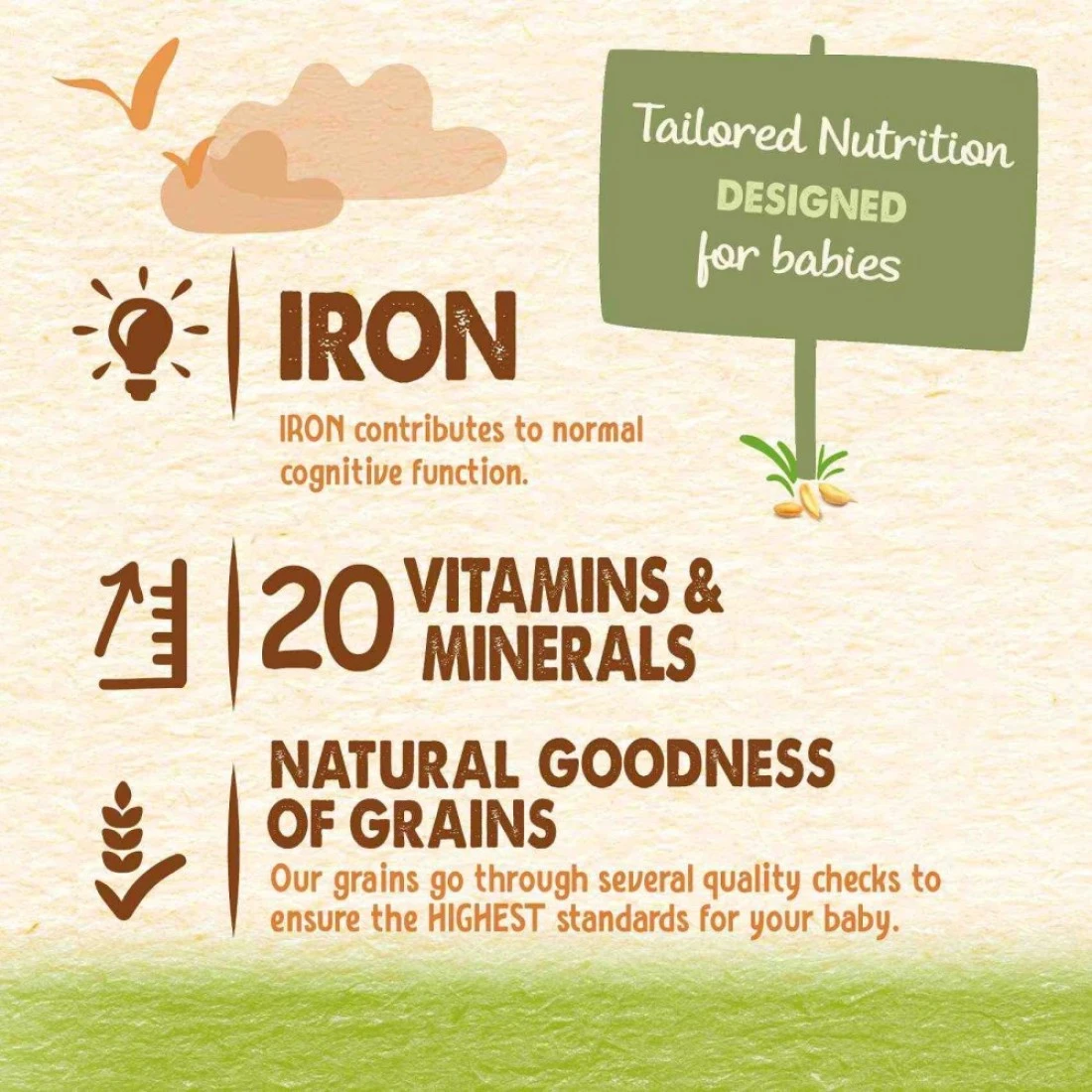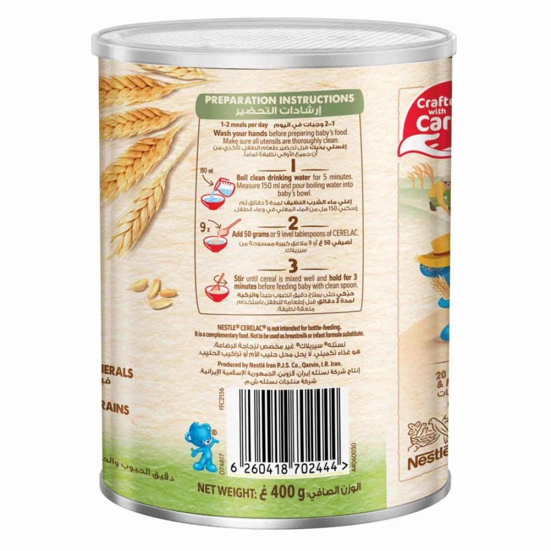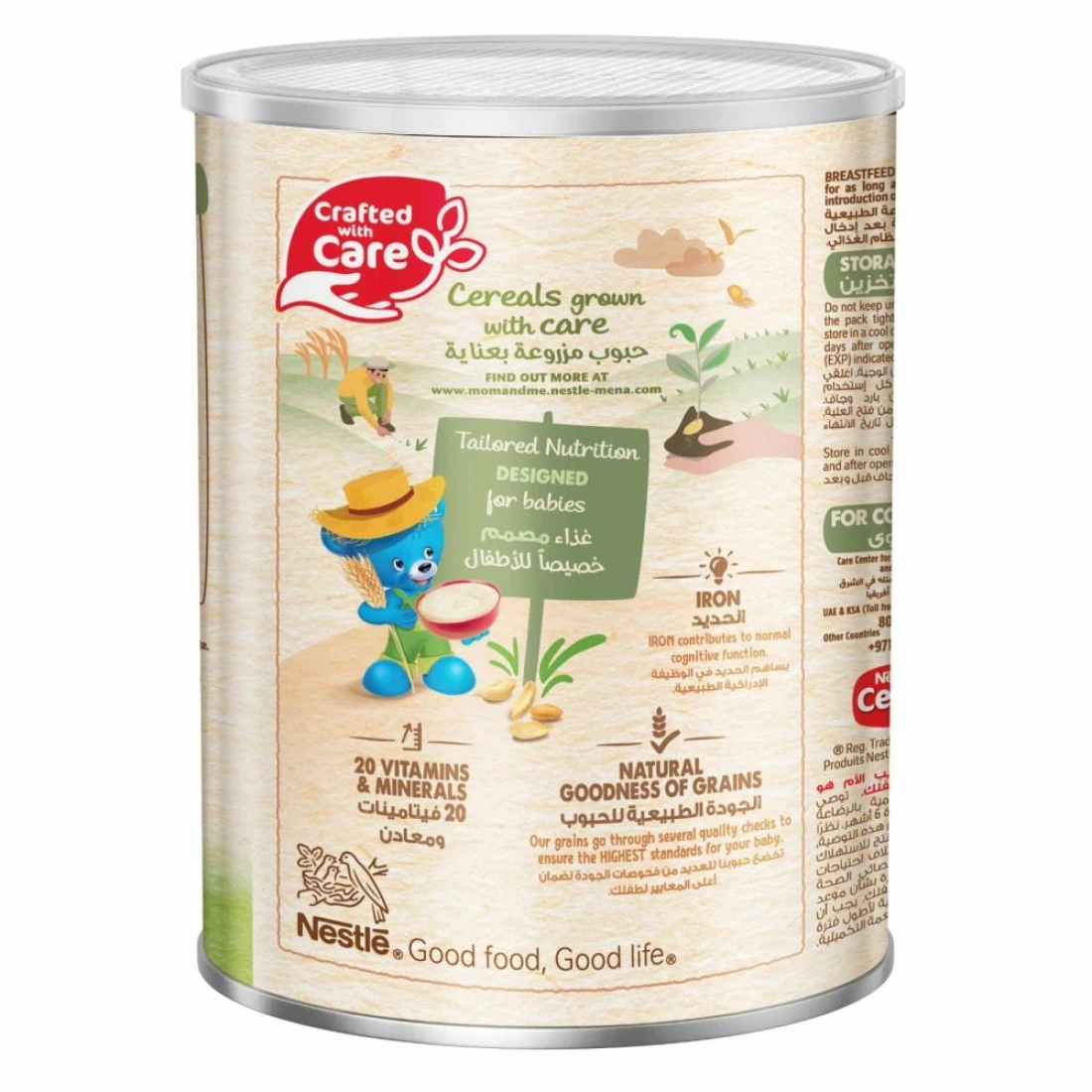 نستله سيريلاك حبوب للرضع بالقمح وقطع الفواكه مع الحليب مدعمة بـ 16 فيتامين ومعدن (بما في ذلك الحديد والكالسيوم وفيتامين D). محضرة بحبوب مختارة بعناية ولا تحتوي على مواد حافظة أو ألوان أو نكهات صناعية. وجبة مصممة خصيصًا للأطفال من عمر 8 أشهر فما فوق.