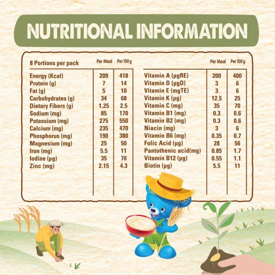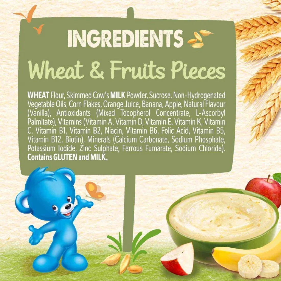 ingredients : دقيق القمح، حليب بقري مجفف منزوع الدسم، سكروز، زيوت نباتية غير مهدرجة، دقيق الذرة، موز، تفاح، نكهات طبيعية (فانيليا وموز)، فيتامينات (فيتامين C، نياسين، فيتامين E، فيتامين B1، حمض البانتوثنيك، فيتامين A، فيتامين B6، فيتامين K، حمض الفوليك، بيوتين، فيتامين D)، معادن (فومارات الحديدوز، كربونات الكالسيوم، كبريتات الزنك، يوديد البوتاسيوم). يحتوي على الغلوتين والحليب. خالي من النكهات الاصطناعية.