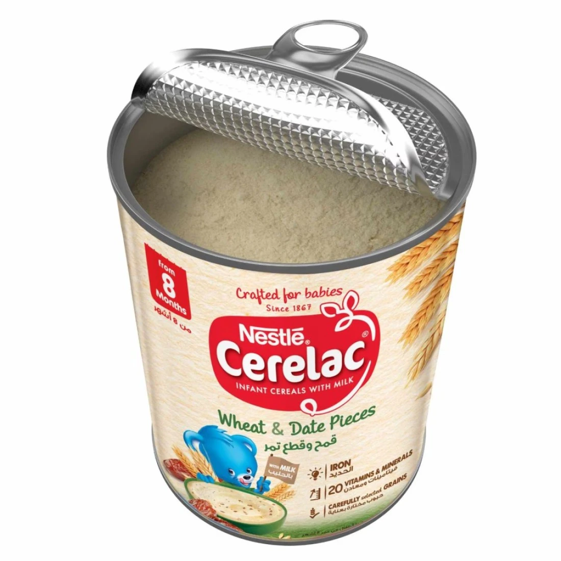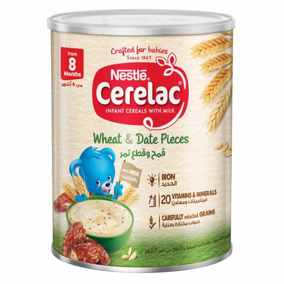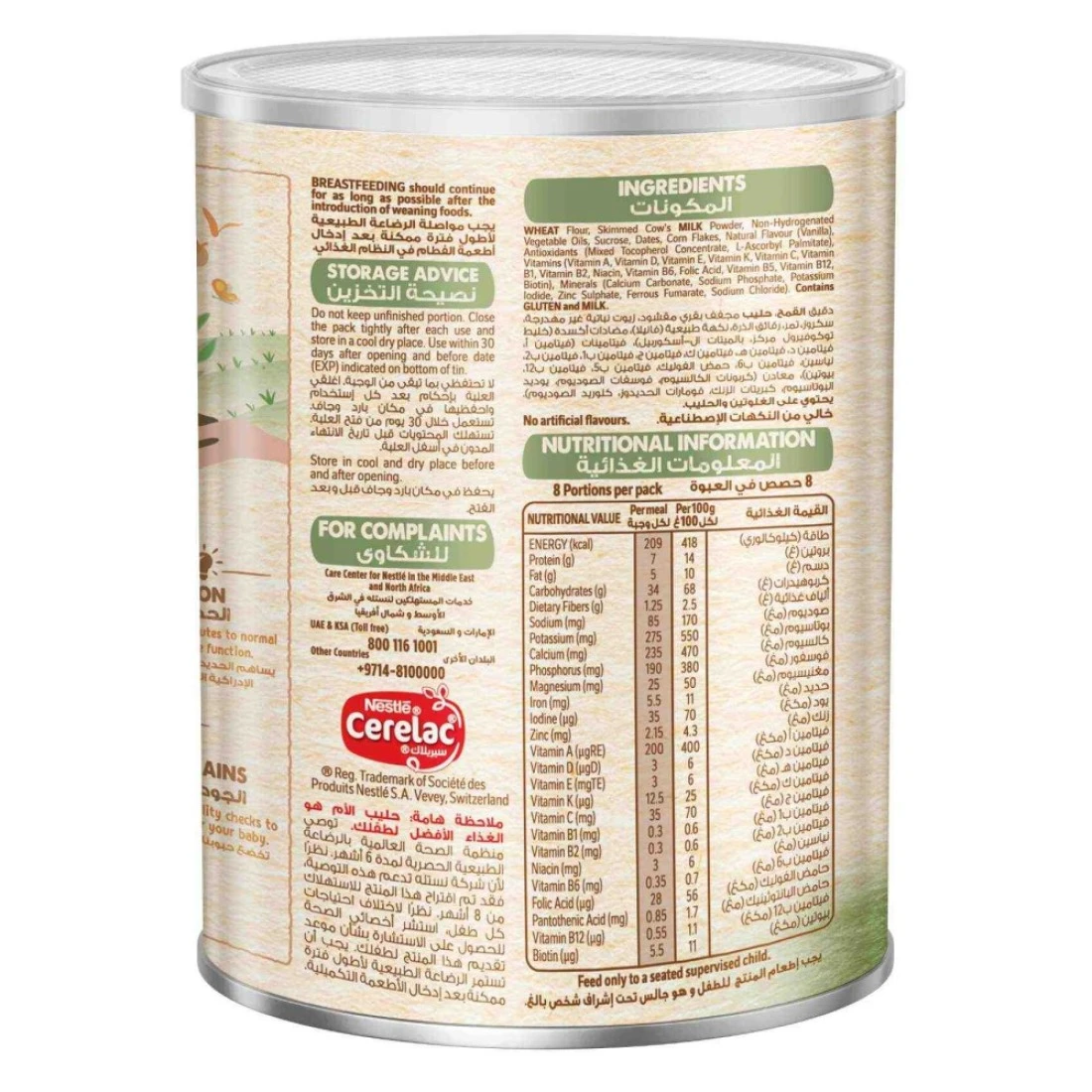 نستله سيريلاك حبوب للرضع بالقمح وقطع التمر مع الحليب مدعمة بـ 16 فيتامين ومعدن (بما في ذلك الحديد والكالسيوم وفيتامين D). محضرة بحبوب مختارة بعناية ولا تحتوي على مواد حافظة أو ألوان أو نكهات صناعية. وجبة مصممة خصيصًا للأطفال من عمر 8 أشهر فما فوق.