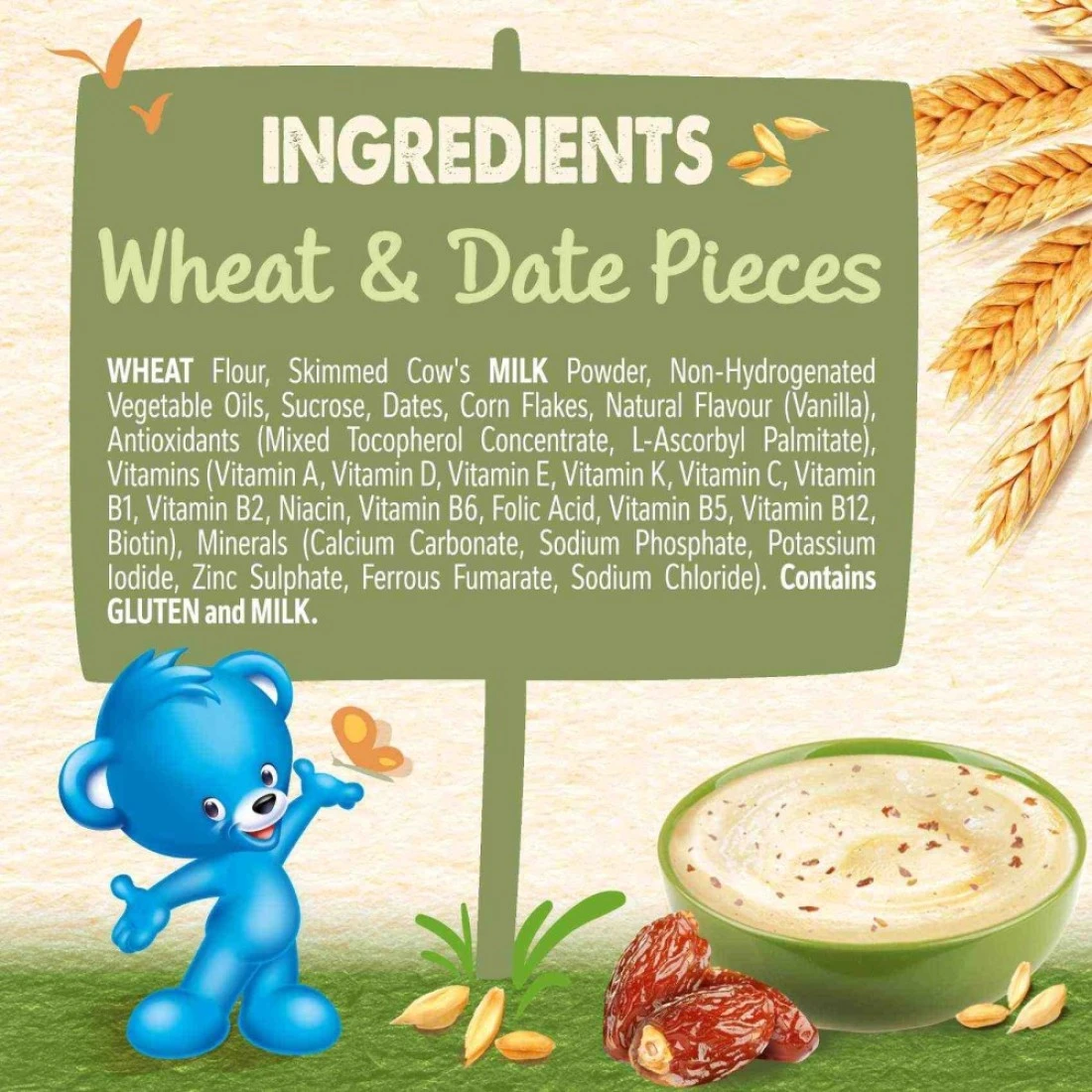 ingredients : دقيق القمح، حليب بقري مجفف منزوع الدسم، سكروز، دقيق الذرة، زيوت نباتية غير مهدرجة، شراب التمر، تمر، سكر مكرمل، نكهة طبيعية (فانيليا)، فيتامينات (فيتامين C، نياسين، فيتامين E، فيتامين B1، حمض البانتوثينيك، فيتامين A، فيتامين B6، فيتامين K، حمض الفوليك، بيوتين، فيتامين D)، معادن (فومارات الحديدوز، كربونات الكالسيوم، كبريتات الزنك، يوديد البوتاسيوم). يحتوي على الغلوتين والحليب. خالي من النكهات الاصطناعية.