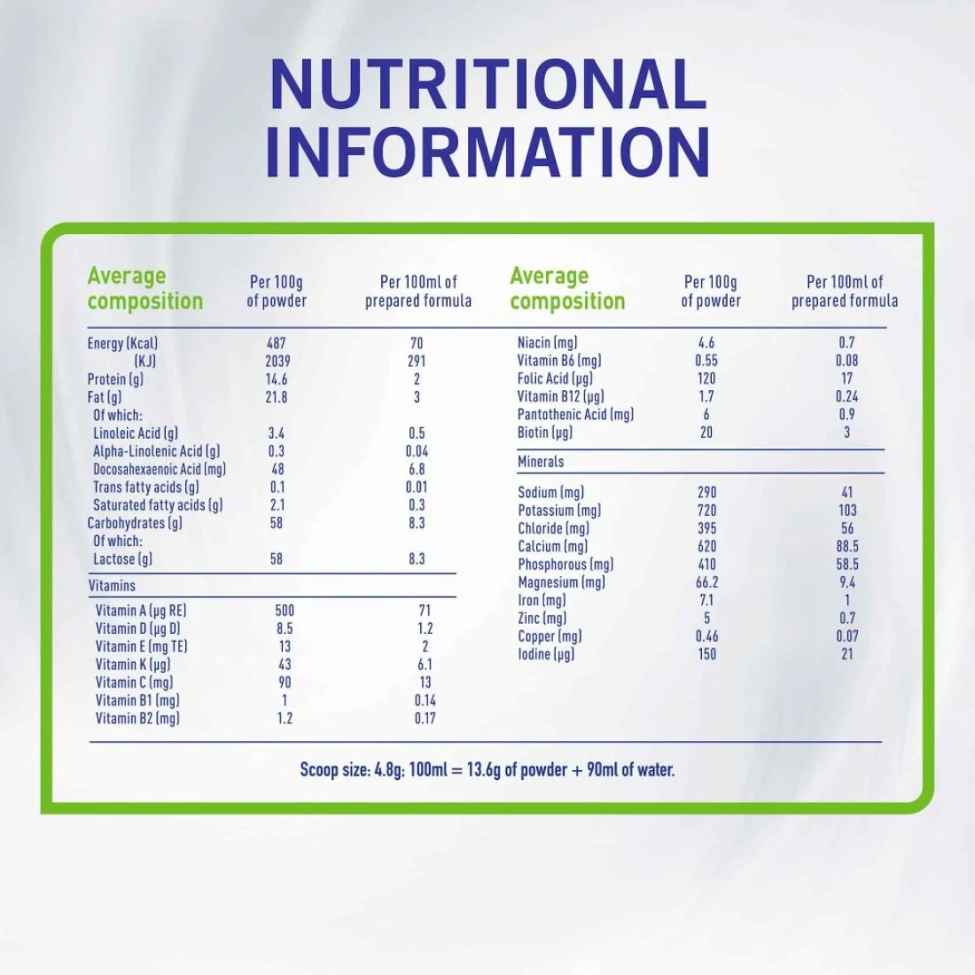 ingredients : حليب البقر منزوع الدسم لاكتوز، زيوت نباتية، زيت عباد الشمس عالي الأوليك، زيت بذور اللفت منخفض الأيروسيك، مسحوق مصل اللبن من مستحلب حليب البقر، ليسيثين الصويا، حمض الدوكوساهيكسانويك من سمك التونة، مركّز مضادات الأكسدة المختلط من التوكوفيرول، إل-أسكوربيل بالميتات، منظم حموضة إل. روتيري. فيتامين سي، فيتامين هـ، حمض البانتوثنيك، النياسين، فيتامين ب1، فيتامين أ، فيتامين ب2، حمض الفوليك، فيتامين ك1، البيوتين، فيتامين د، فيتامين ب12، معادن، كالسيوم، السترات، الصوديوم، السترات، المغنيسيوم، السترات، البوتاسيوم، السترات الحديدية، كبريتات الزنك، كبريتات النحاس، كبريتات البوتاسيوم، يوديد