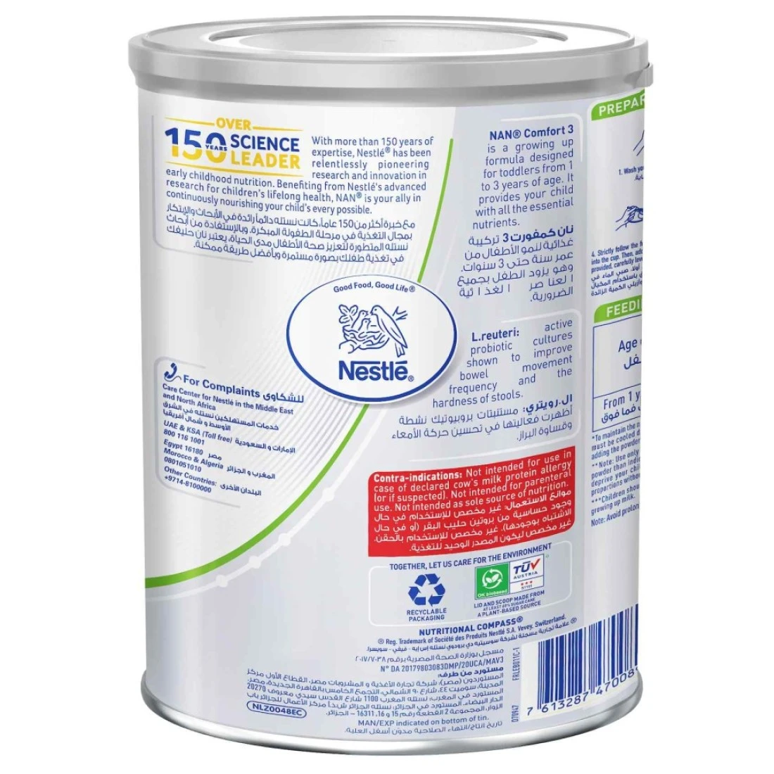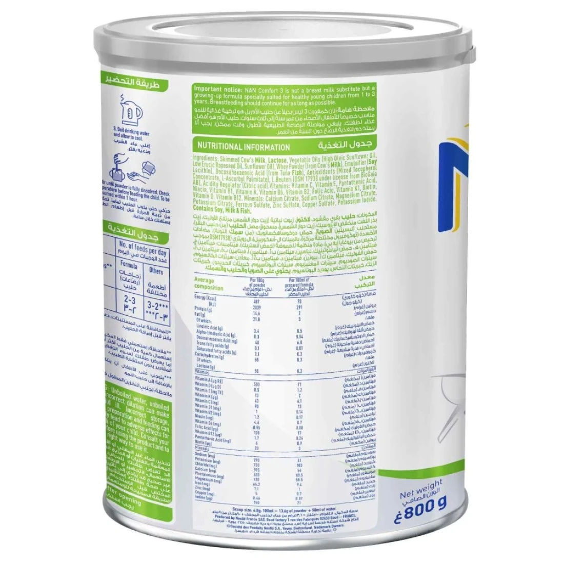 تم تصميم تركيبة حليب نستله نان كومفورت 3 للنمو خصيصًا للأطفال الصغار الذين تتراوح أعمارهم بين 1 إلى 3 سنوات. توفر هذه التركيبة التي يبلغ وزنها 800 غرام العناصر الغذائية الأساسية لدعم النمو والتطور الصحي خلال هذه المرحلة الحاسمة من الطفولة المبكرة. يساعد نان كومفورت 3، الغني بمزيج متوازن من الفيتامينات والمعادن والبريبايوتكس، على تعزيز صحة الجهاز الهضمي وتقوية جهاز المناعة. تم تصميم تركيبته الفريدة لتكون لطيفة على معدة الطفل، مما يضمن حصول طفلك على التغذية التي يحتاجها أثناء الاستمتاع بالانتقال السلس من الرضاعة الطبيعية أو حليب الأطفال. مثالية للأطفال الصغار النشطين، تدعم هذه التركيبة احتياجاتهم من الطاقة ورفاهيتهم العامة.