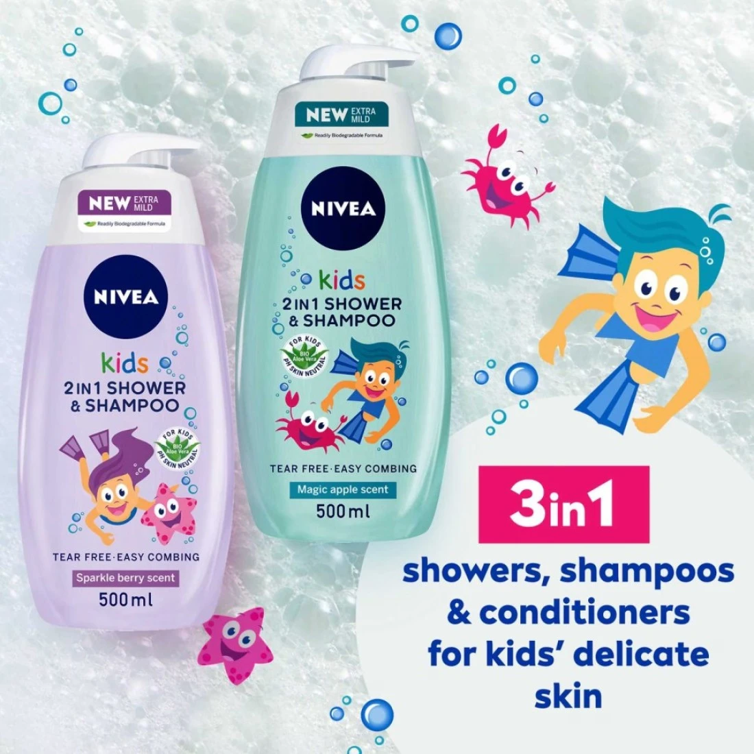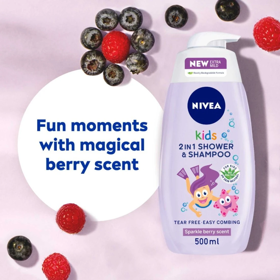 نيڤيا كيدز شاور وشامبو وبلسم 2 في 1 سباركل بيري سينت بيربل 500 ملل