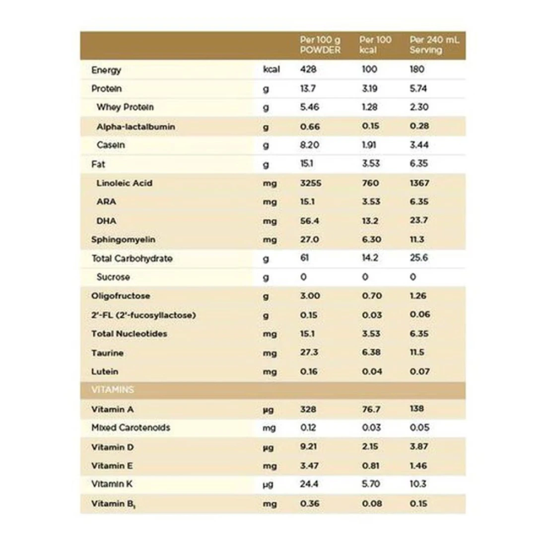 ingredients : مواد صلبة من الحليب، زيت فول الصويا، زيت عباد الشمس عالي الأوليك، زيت جوز الهند، منظمات الحموضة (سترات البوتاسيوم، سترات الصوديوم، هيدروكسيد الكالسيوم، حمض الستريك، بيكربونات الصوديوم، وهيدروكسيد البوتاسيوم)، معادن، فيتامينات، مزيج زيت (حمض الأراكيدونيك (Are) من زيت ماتاريلا ألبينا، زيت عباد الشمس عالي الأوليك ومضادات الأكسدة (مركز توكوفيرول مختلط وبالميتات الأسكوربيك))، مستحلب (ليسيثين الصويا)، مزيج زيت (حمض الدوكوساهيكسانويك (Dha) من زيت كريب صوديوم كوني، زيت عباد الشمس عالي الأوليك ومضادات الأكسدة (بالميتات الأسكوربيك مختلط ومركز توكوفيرول مختلط))، إينوزيتول ومضادات الأكسدة (مركز توكوفيرول مختلط وبالميتات الأسكوربيك))