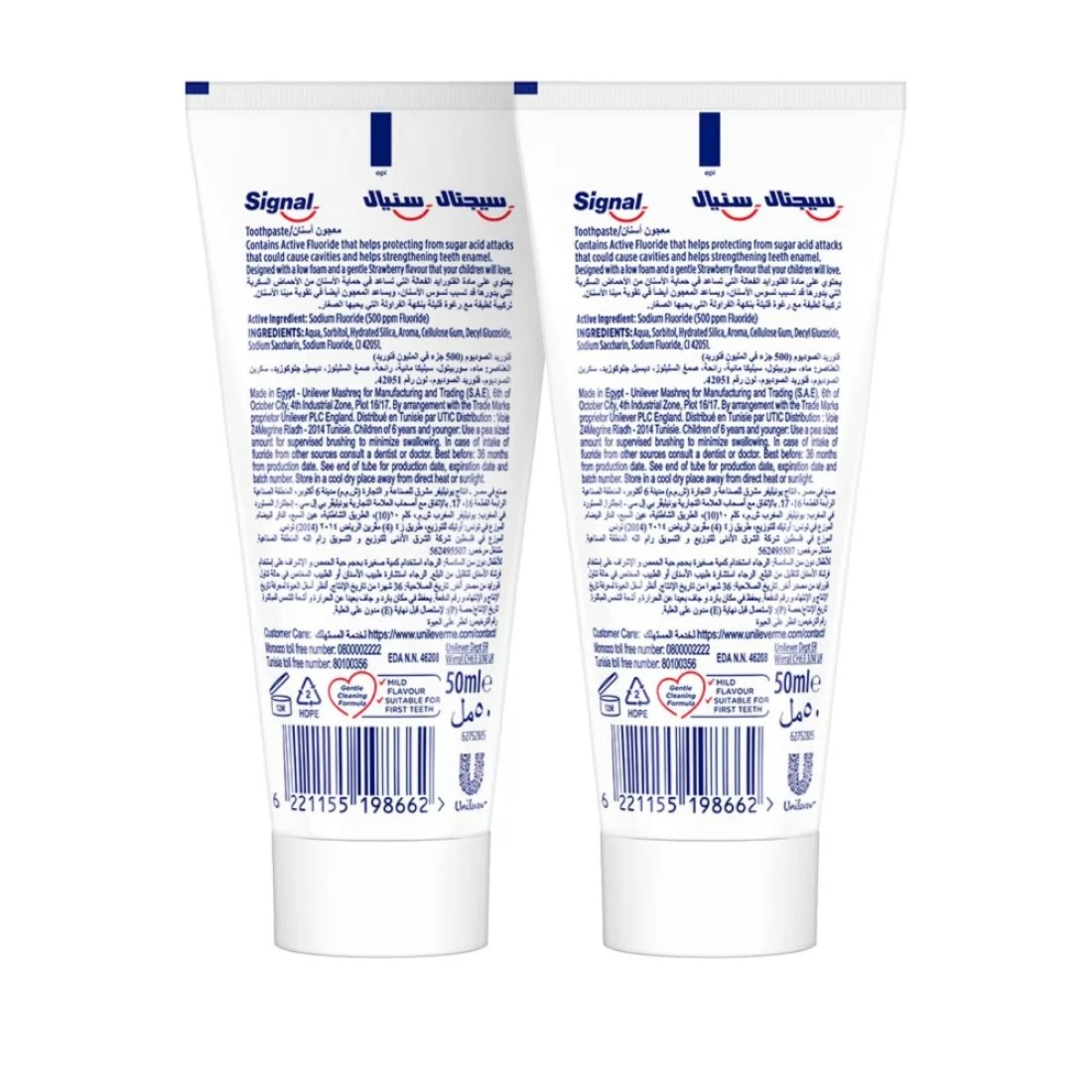 هل تعلمين أن تنظيف الأسنان بالفرشاة قبل النوم يوازي أهمية تنظيفها صباحًا؟ ففي الليل، قد تتسبب البكتيريا بتراكم البلاك على أسنان أطفالك. ساعدي أطفالك على تجنب تسوس الأسنان وتآكلها ودعيهم ينتظرون وقت تنظيف أسنانهم بفارغ الصبر بفضل معجون الأسنان سيجنال كيدز للأطفال! اختاري المعجون الذي سيأخذ أطفالك في جولة من المغامرات الاستثنائية ليشعروا بالفرح والمرح! إن معجون الأسنان سيجنال بنكهة الفراولة مصنوع خصيصًا للأطفال. ولا شك في أن أسنان أطفالك تحتاج إلى عناية خاصة. فمينا أسنان الأطفال والأسنان اللبنية والأسنان في طور النمو ليست صلبة وقوية كمينا أسنان الراشدين وأسنانهم. مما يجعل أسنان أطفالك أكثر عرضة للتآكل. لا تقلقي فلقد ابتكر فريق البحث الخاص بسيجنال هذا المعجون المثالي للأطفال. إذ يحتوي على الفلورايد المعروف بقدرته على محاربة تسوس الأسنان ومساهمته في الحفاظ على نظافة الأسنان. إن هذا المعجون خالٍ من السكر، والمواد الحافظة، وكبريتات لوريث الصوديوم. أشرفي على عملية تنظيف الأسنان بالفرشاة إلى أن يستطيع أطفالك إتمام هذه المهمة بمفردهم. وتأكدي من أنهم لم يبتلعوا معجون الأسنان. للأطفال الذي يبلغون من العمر سنتين أو أكثر: يُرجى تنظيف الأسنان جيدًا بالفرشاة بعد تناول كل وجبة طعام أو مرتين يوميًا على الأقل. وعند الحاجة، يُرجى مراجعة طبيب أسنان أو أحد الأخصائيين. حفزي أطفالك على اكتساب عادة تنظيف أسنانهم وعلميهم كيفية غسل أسنانهم بالماء لئلا يبتلعوا الكثير من معجون الأسنان. للأطفال الذين تقل أعمارهم عن السنتين: يُرجى مراجعة طبيب أسنان أو أحد الأخصائيين