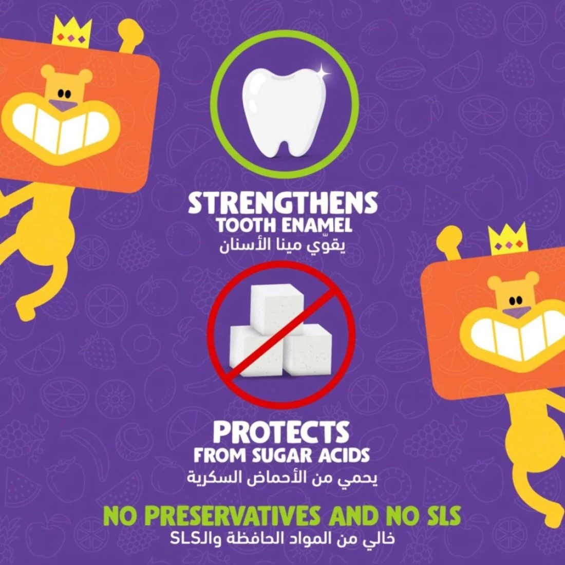 - غني بالفلورايد النشط: يحتوي معجون الأسنان على الفلورايد النشط الذي يساعد على حماية الأسنان من أحماض السكر ويساعد على تقوية المينا.