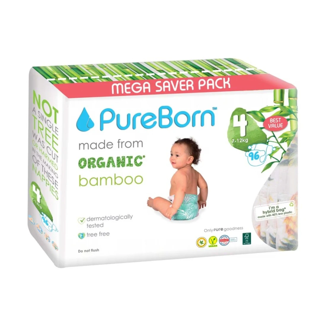 بيور بورن حفاض من الخيزران العضوي مقاس 4، 7-12 كغ حزمة اقتصادية 96 حفاض