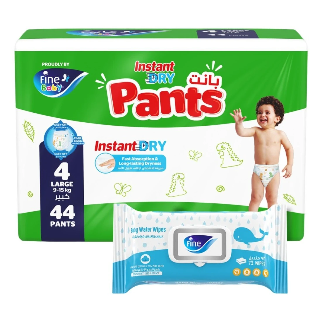 فاين حفاض بتصميم سروال سريع الجفاف مقاس كبير 4 للأطفال بوزن من 9 إلى 15 كغ ، 44 حفاض ومناديل مبللة للأطفال 72 منديل