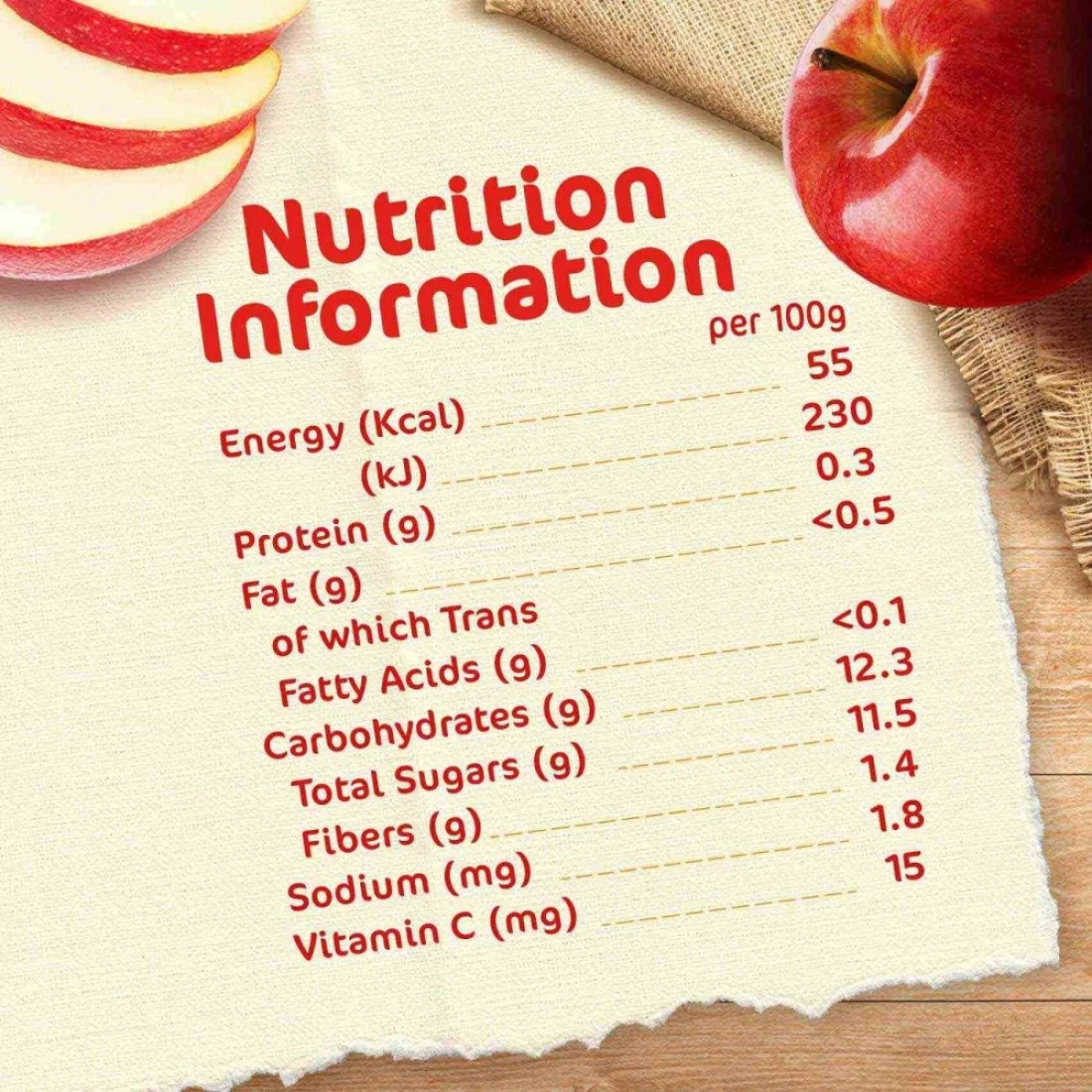 ingredients : هريس التفاح 98%، عصير التفاح المركز، عصير الليمون المركز، فيتامين سي.