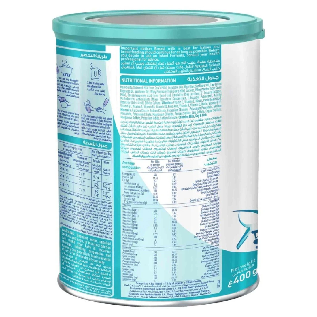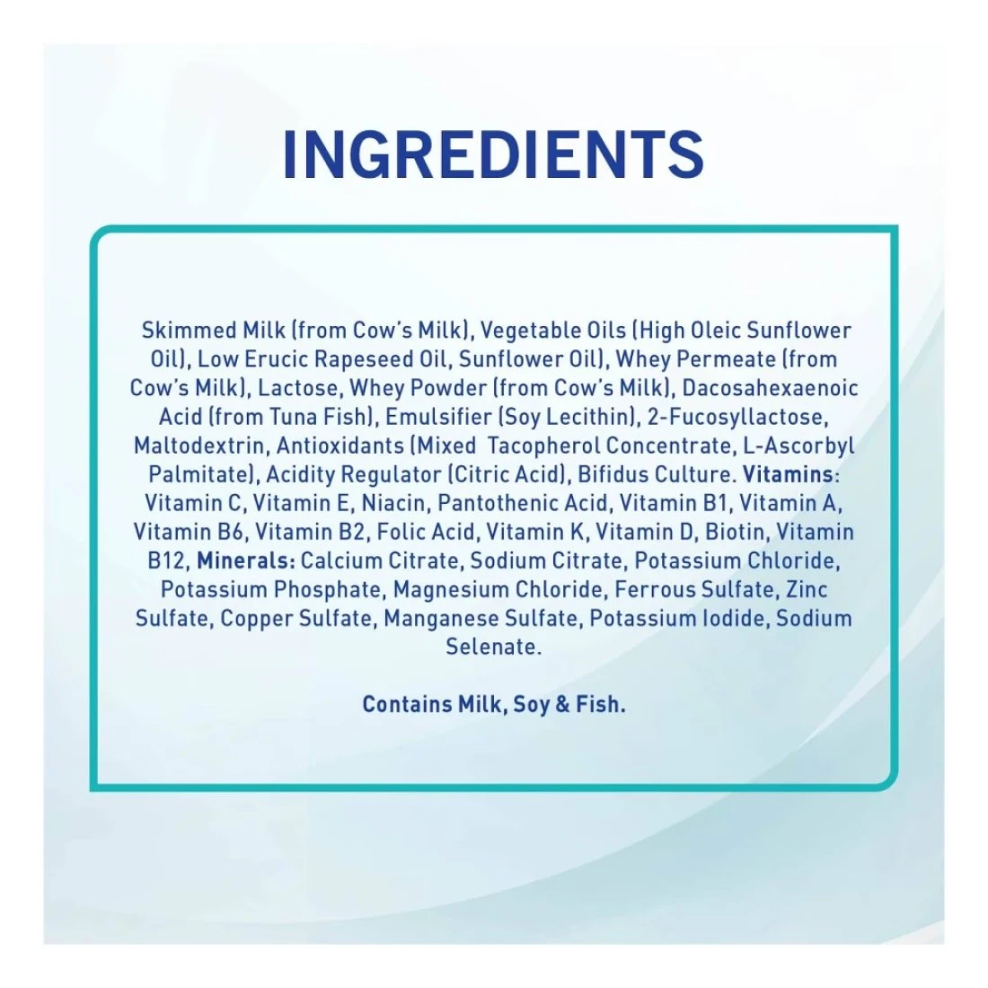 ingredients : زيت بذور اللفت، زيت عباد الشمس، مصل اللبن من حليب البقر لاكتوز، مسحوق مصل اللبن من حليب البقر الدوكوساهيكسانويك، حمض من سمك التونة المستحلب، ليسيثين الصويا 2'فوكوسيلاكتوز مالتوديكسترين مضادات الأكسدة، تركيز التوكوفيرول المختلط، منظم الحموضة بالميتات الأسكوربيل، حمض الستريك خمائر بيفيدوس. الفيتامينات فيتامين سي، فيتامين هـ، النياسين، حمض البانتوثنيك، فيتامين ب1، فيتامين أ، فيتامين ب2، فيتامين ب6، حمض الفوليك، فيتامين ك، فيتامين د، البيوتين، فيتامين ب12. معادن، كالسيوم، سترات الصوديوم، سترات كلوريد البوتاسيوم، فوسفات البوتاسيوم، الصوديوم، فوسفات البوتاسيوم، سترات المغنيسيوم، كلوريد، كبريتات الحديدوز، كبريتات الزنك، كبريتات النحاس، كبريتات المنغنيز، يوديد البوتاسيوم، سيلينات الصوديوم