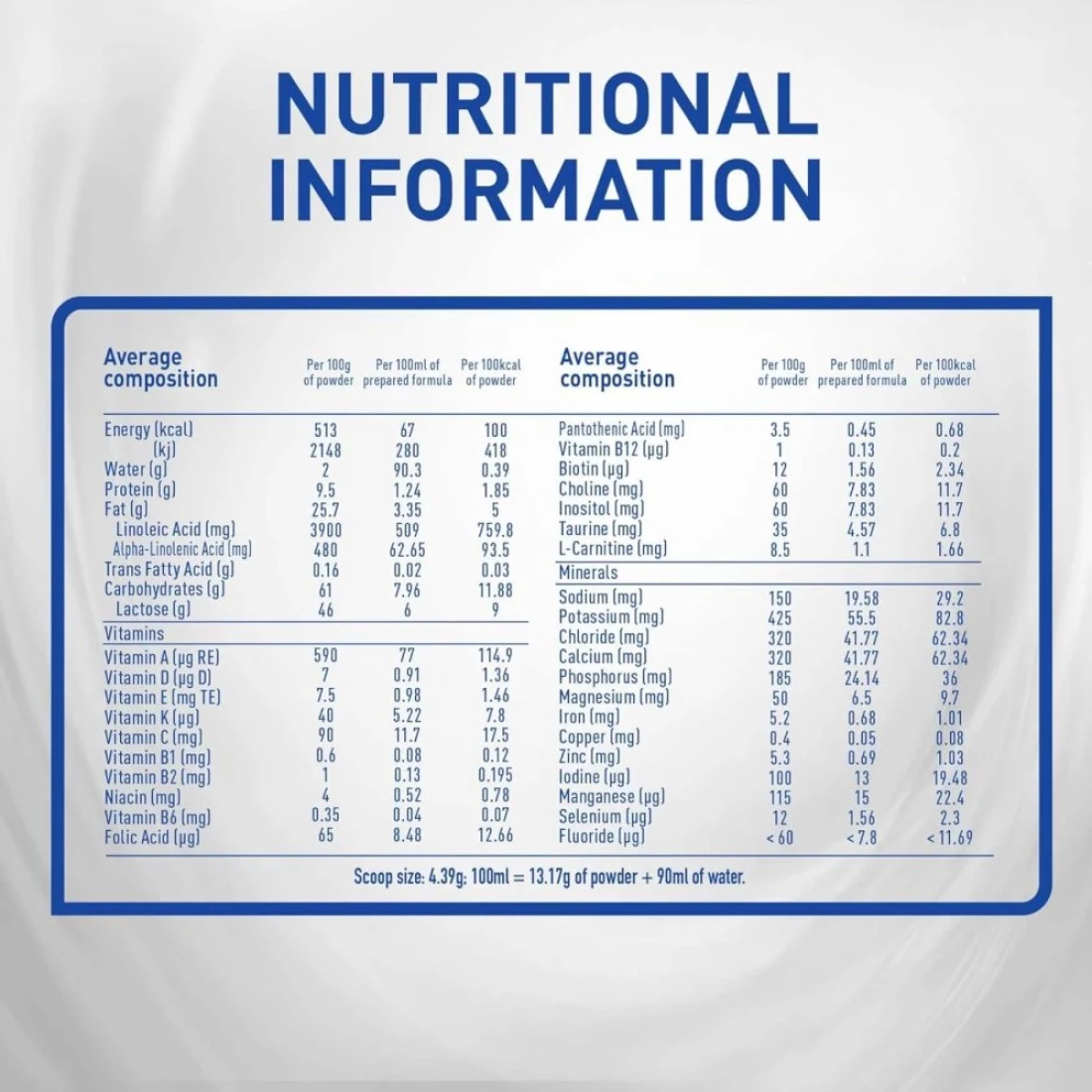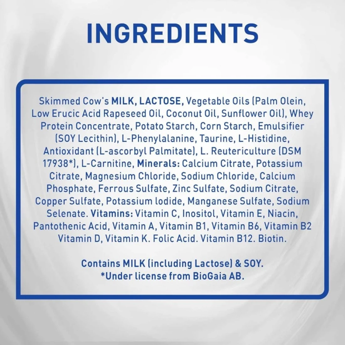 ingredients : حليب البقر منزوع الدسم، لاكتوز، زيوت نباتية، أولين النخيل، حمض الإيروسيك المنخفض، زيت بذور اللفت، زيت جوز الهند، زيت عباد الشمس، مركز بروتين مصل اللبن، نشا البطاطس، مستحلب نشا الذرة، ليسيثين الصويا، إل فينيل ألانين تورين، إل هيستيدين إينوزيتول، خمائر لاكتوباسيلوس روتيري DSM 17938 إل كارنيتين الفيتامينات ومعادن