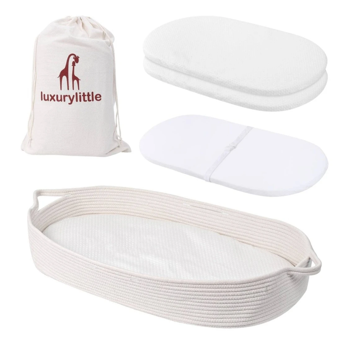 Luxury Little Baby Changing Moses Basket with Memory Foam Mattress, Waterproof Changing Pad Covers, Boho Changing Station for Nursery Decor, 100% Cotton Rope, Portable Baby Lounger