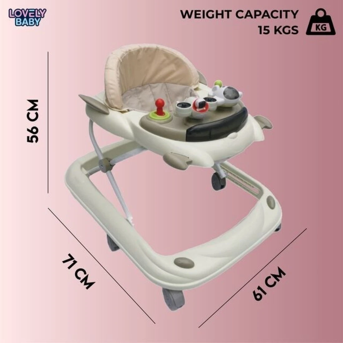 Lovely Baby Foldable Kids Walker BW10 with Adjustable Height, Musical Toys, Rotating Wheels, Comfortable & Safe Activity Walker for Toddlers, Small Infant Boy Girl 6-18 months - Beige