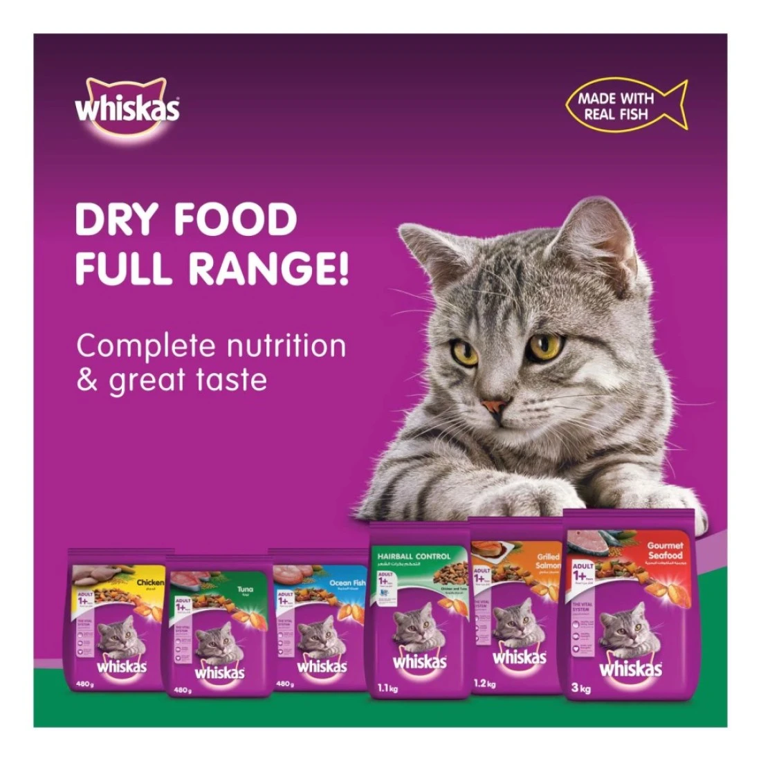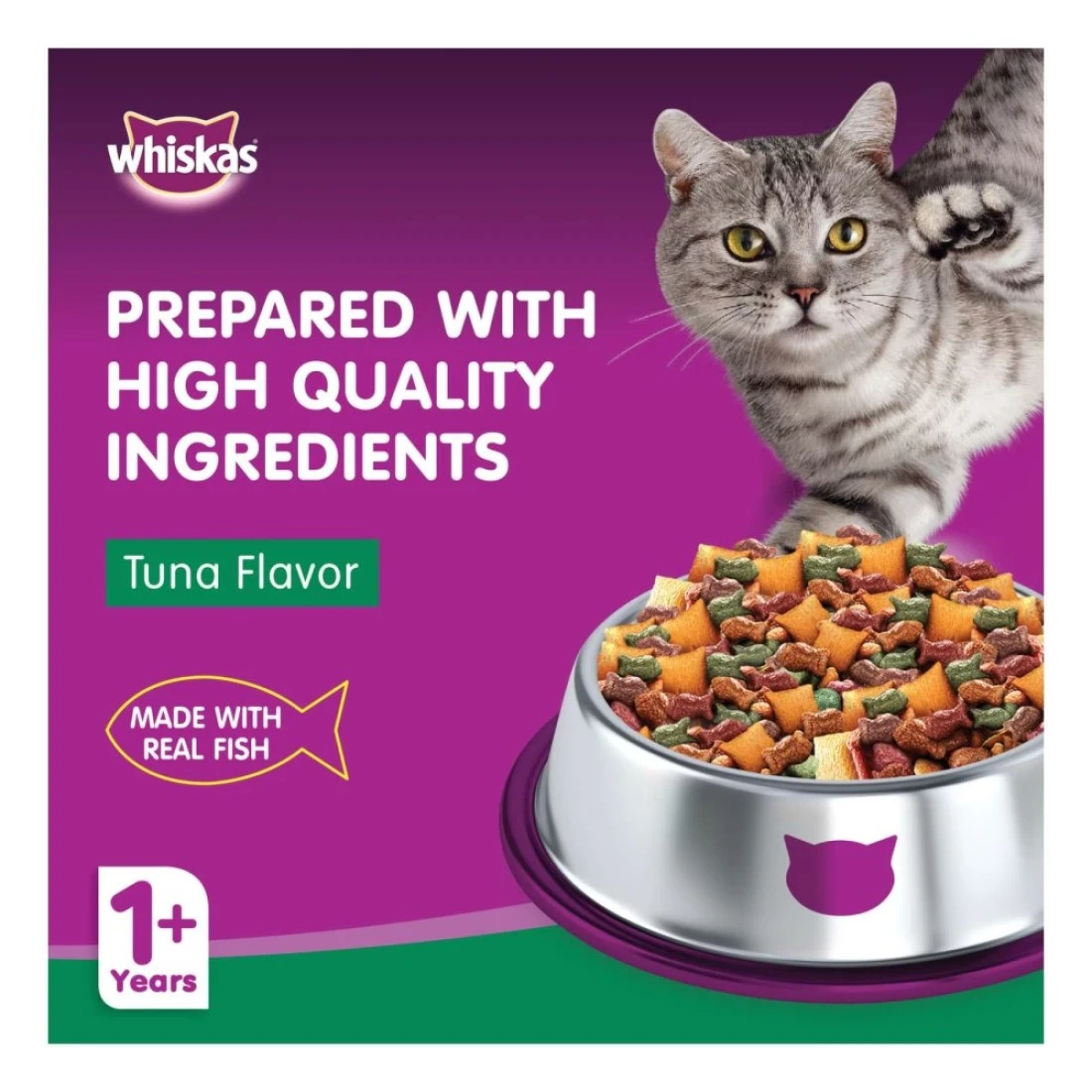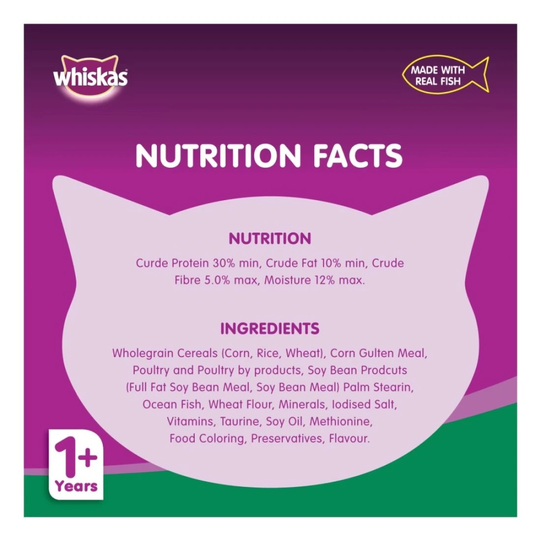 ingredients : الحبوب الكاملة (الذرة والأرز والقمح)، دقيق الذرة الغلوتين، الدواجن والدواجن حسب المنتجات، منتجات فول الصويا (فول الصويا كامل الدسم، وجبة فول الصويا) ستيرين النخيل، أسماك المحيط، دقيق القمح، المعادن، الملح المعالج باليود، الفيتامينات، التوراين، زيت الصويا، الميثيونين، ملونات الطعام، المواد الحافظة والنكهة