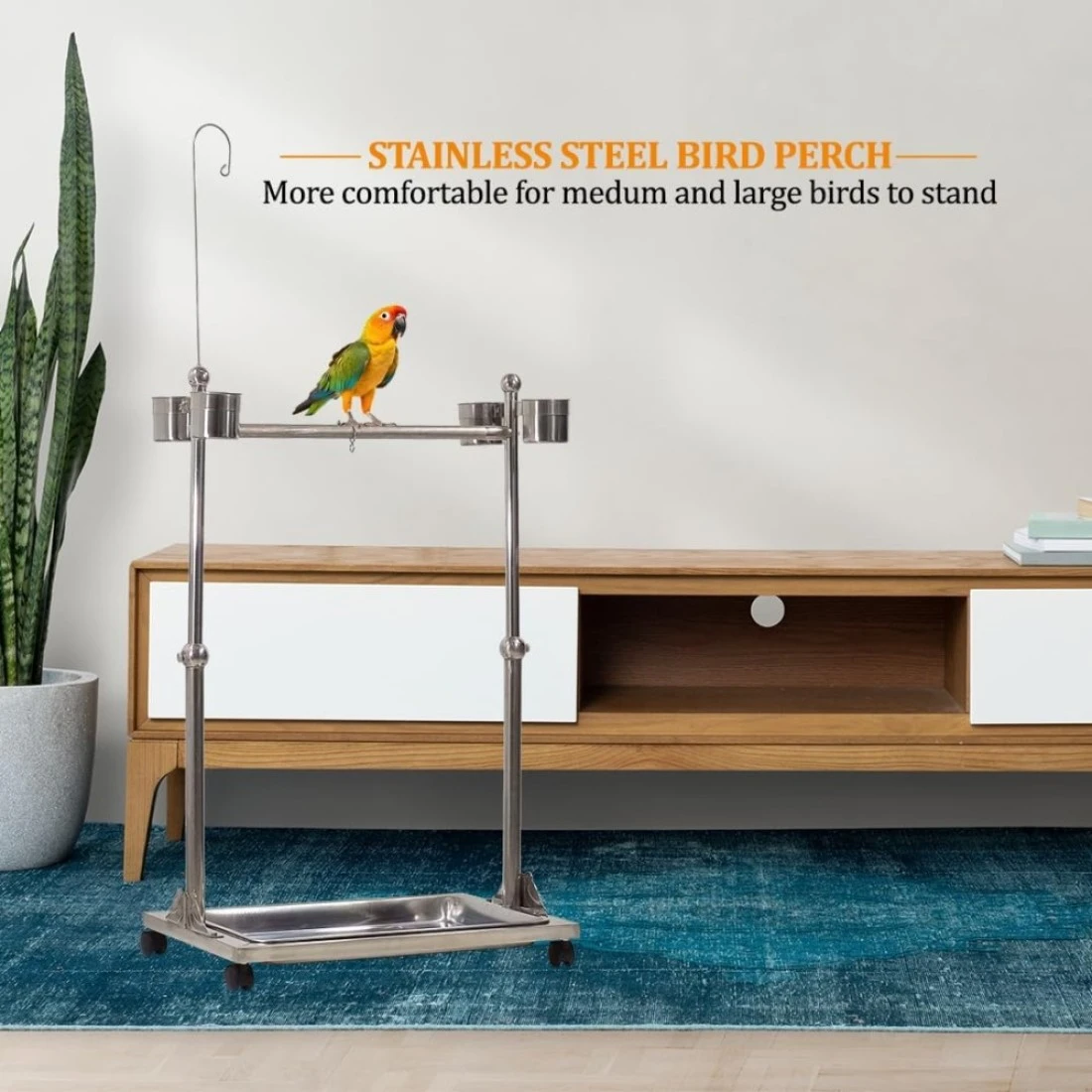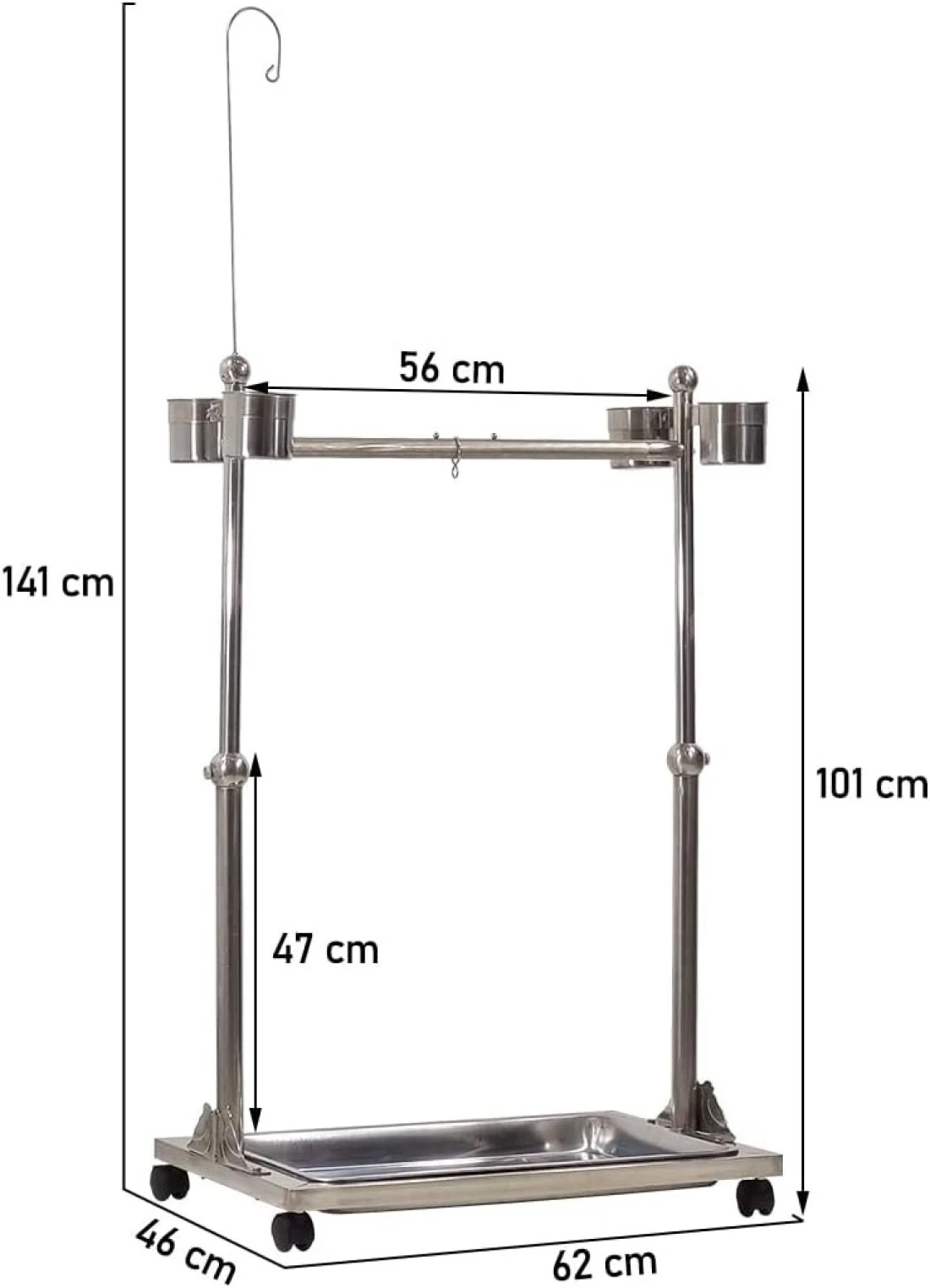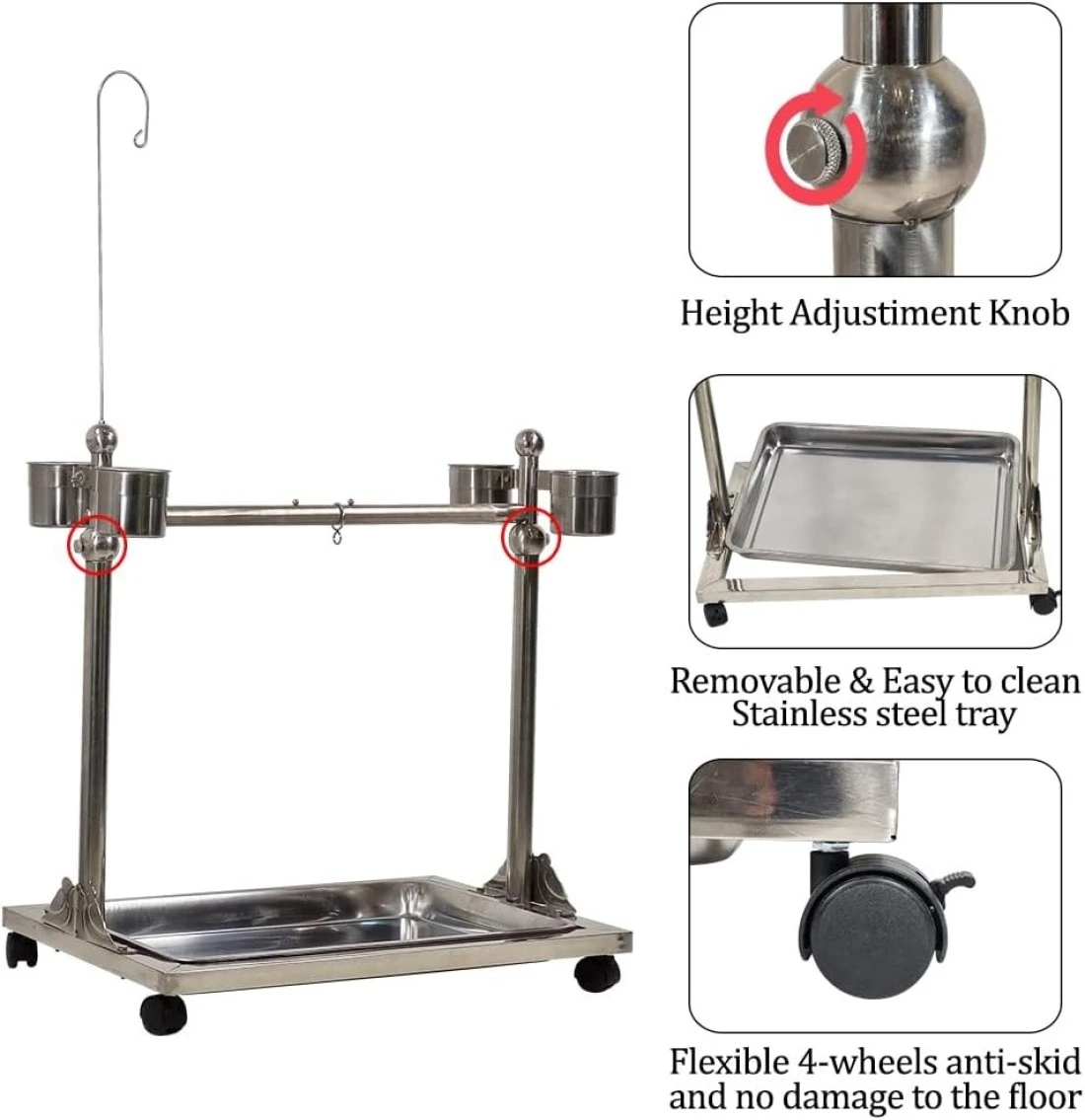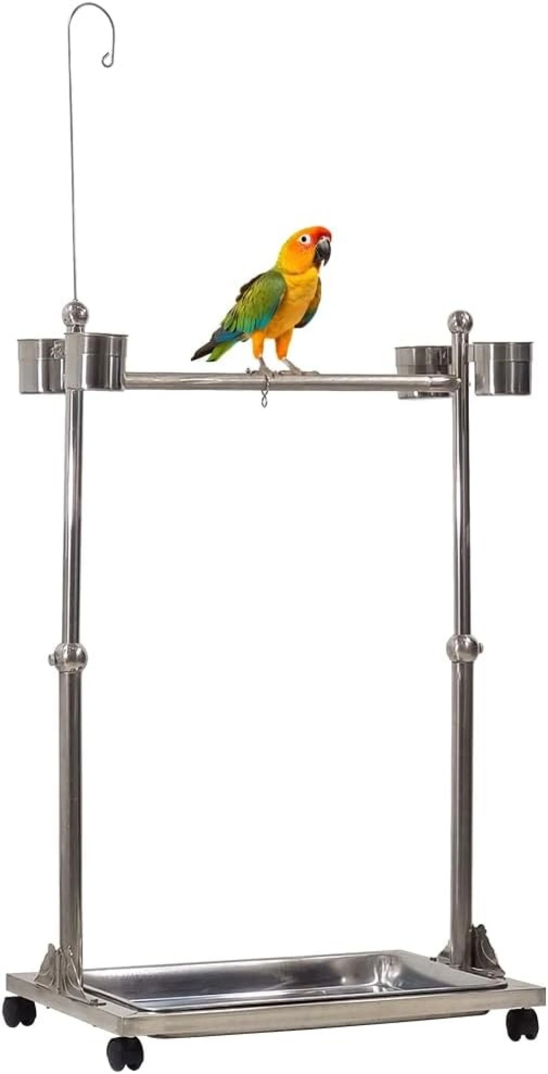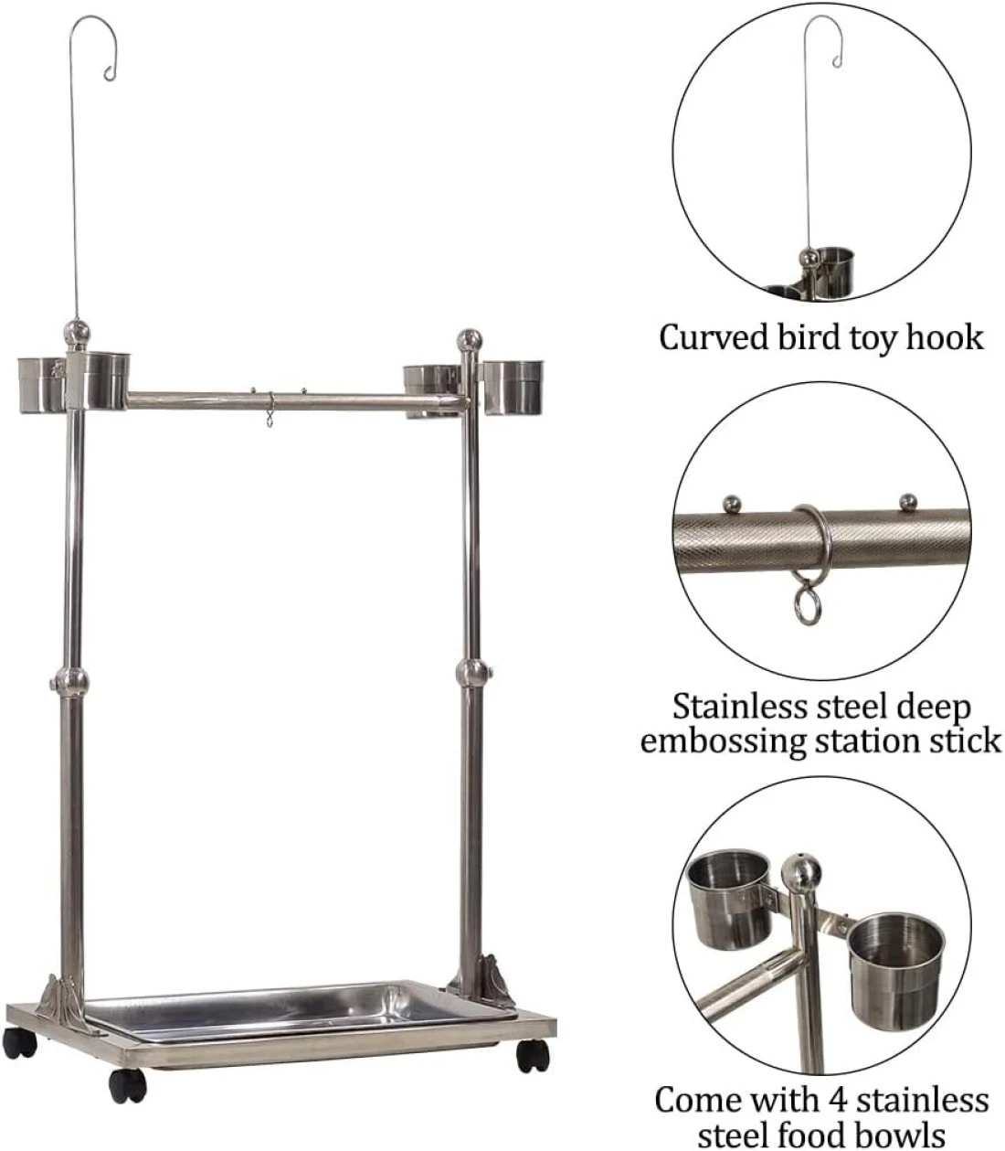 Bird stand, Adjustable stainless steel parrot stand Toy hook, Food bowls, Standing perch, Removable tray, and universal wheels, Bird play stand for indoor and outdoor 141 cm (Silver)