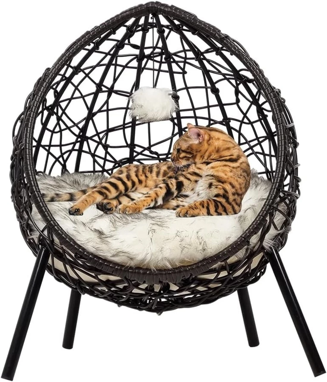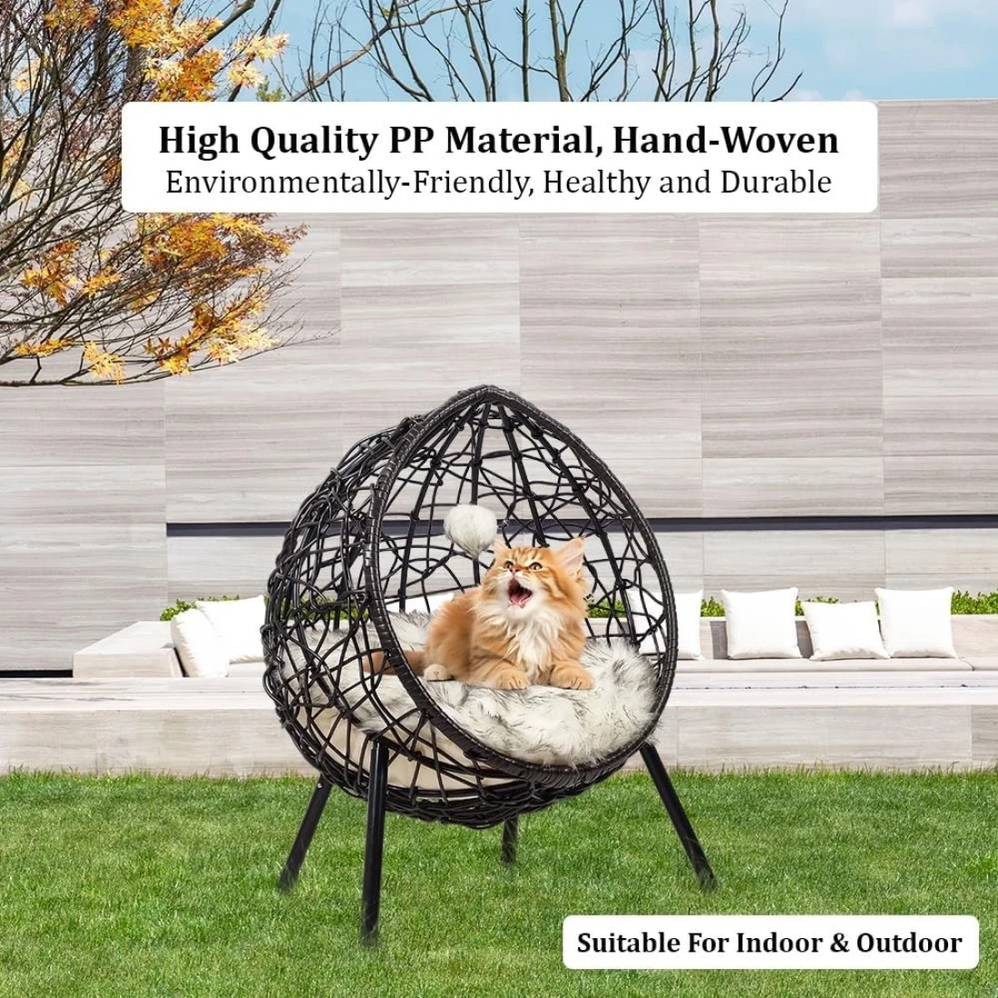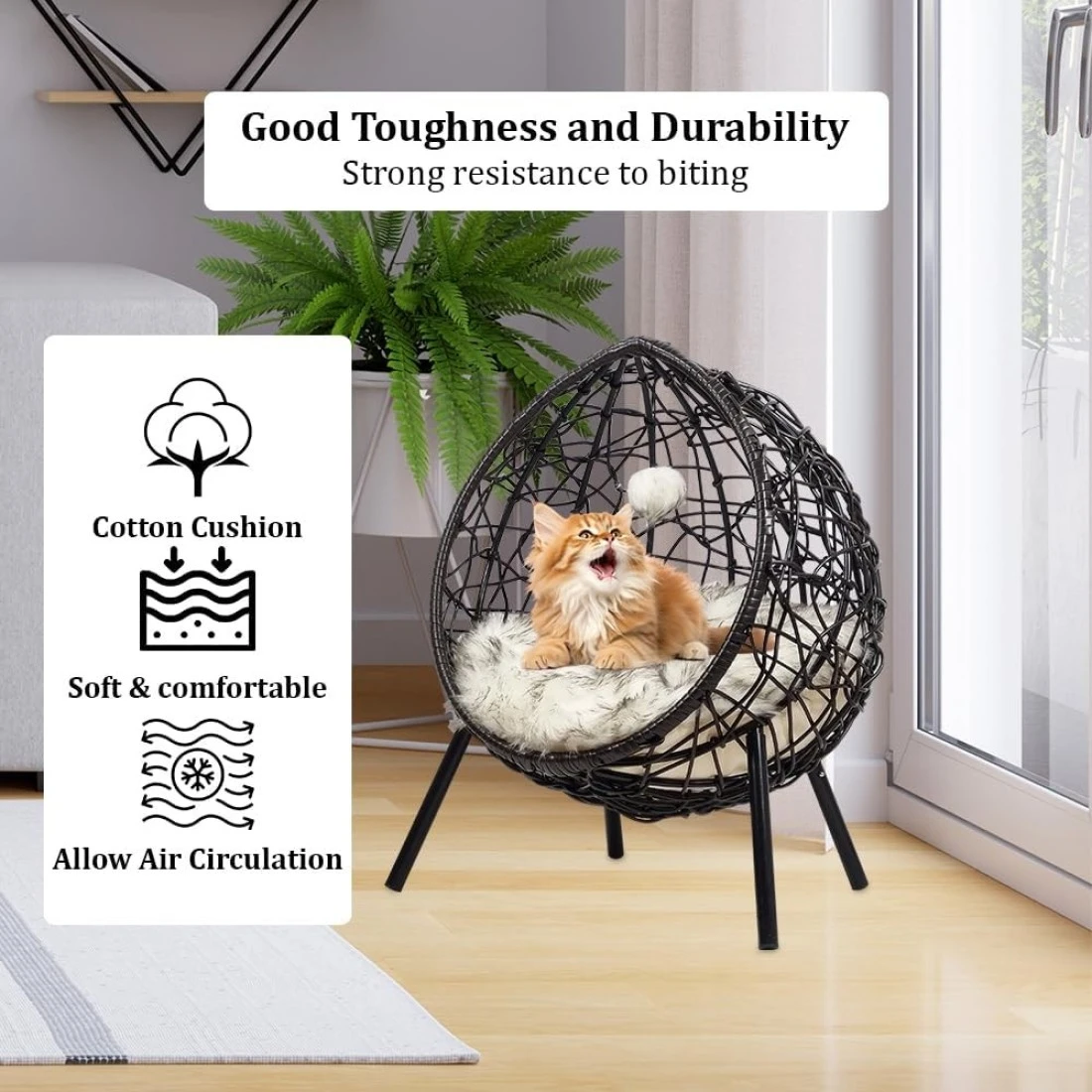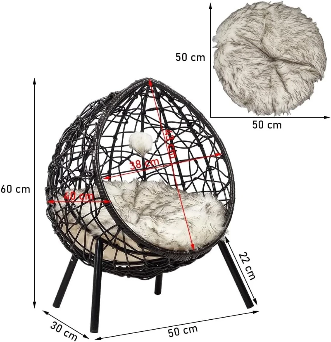 Rattan cat basket chair with soft comfy cushion and play ball, Luxury rattan pet furniture for indoor and outdoor use, Suitable for cats and small dogs 60 cm (Black)