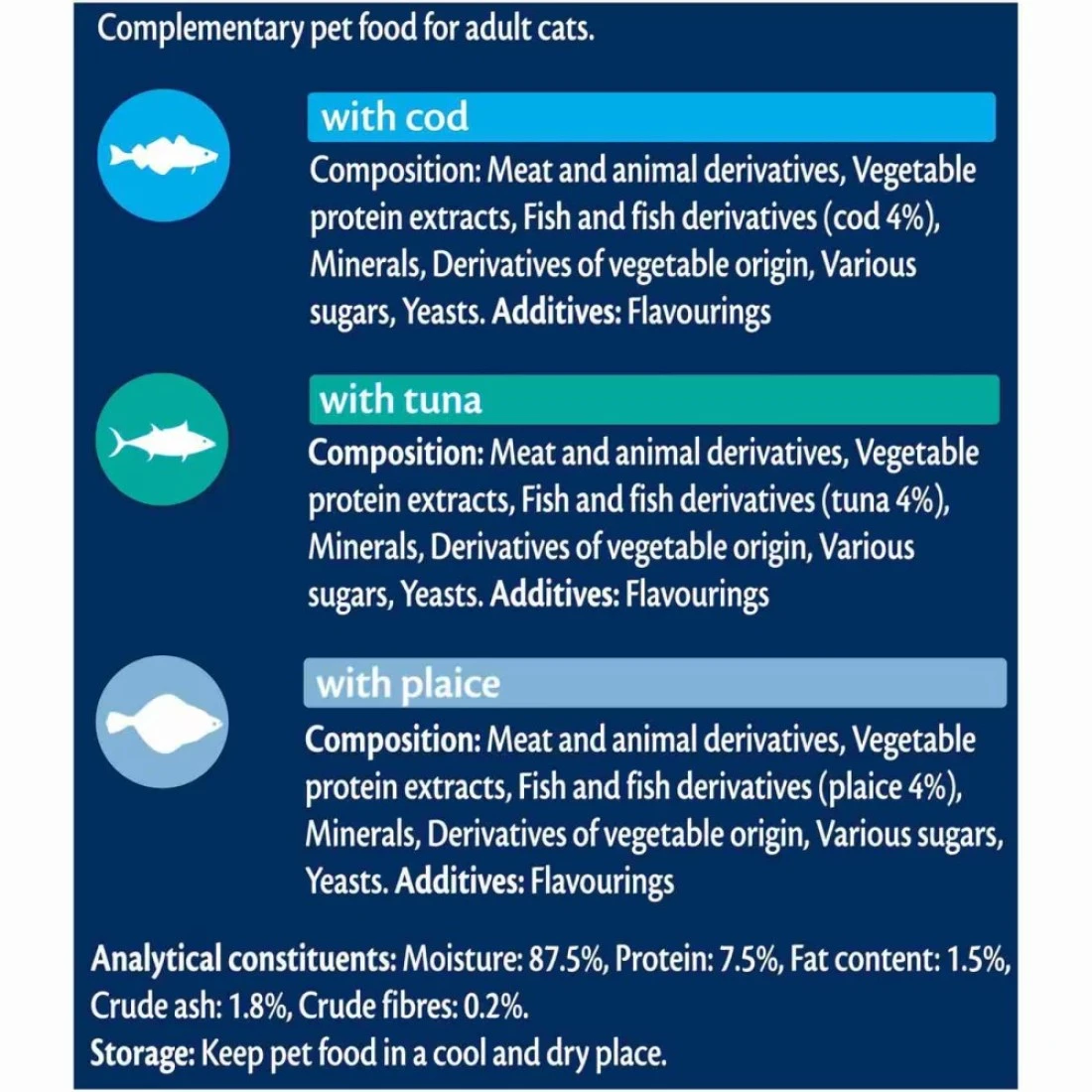 ingredients : لحم القد، مشتقاته الحيوانية، مستخلصات البروتين النباتي، الأسماك، ومشتقات الأسماك، سمك القد 4 بالمائة، معادن مشتقات من أصل نباتي سكريات مختلفة الخمائر. مع تونة اللحوم ومشتقاتها الحيوانية مستخلصات البروتين النباتي، أسماك، ومشتقات أسماك تونة 4 بالمائة، معادن، مشتقات من أصل نباتي، سكريات مختلفة، خمائر. سمك موسى، لحوم ومشتقاتها الحيوانية، مستخلصات البروتين النباتي، أسماك، ومشتقات السمك، سمك موسى 4 بالمائة، معادن، مشتقات من أصل نباتي، سكريات مختلفة، خمائر.