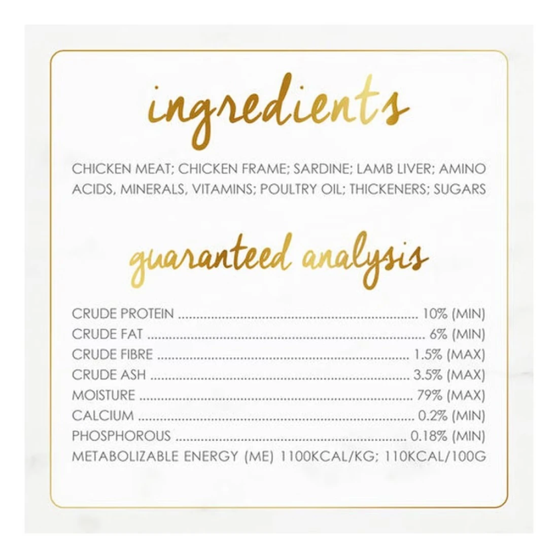 ingredients : لحم دجاج ، هيكل دجاج ، سردين ، كبد ضأن ، أحماض أمينية ، معادن ، فيتامينات ، زيت دواجن ، مكثفات ، سكريات
