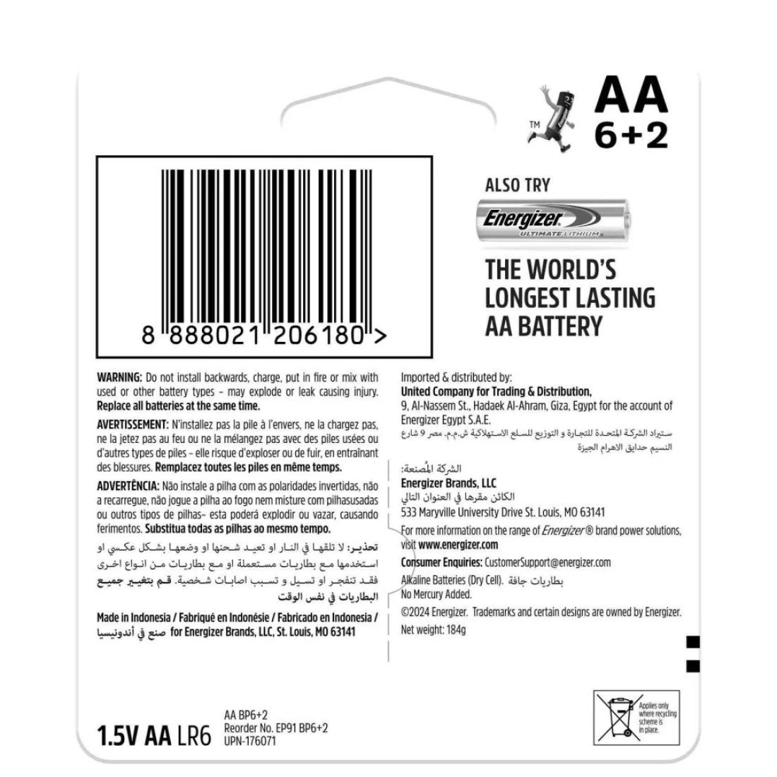 - 8 بطاريات إنرجايزر ماكس بلس AA، القلوية