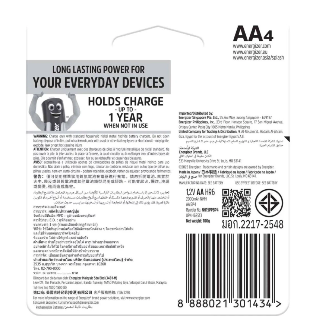 - طويلة الأمد: تدوم بطاريات إنرجايزر القابلة لإعادة الشحن AA لمدة تصل إلى أربع مرات أطول (قد تختلف حسب الجهاز) من البطاريات القلوية الأساسية من إنرجايزر في الكاميرات الرقمية