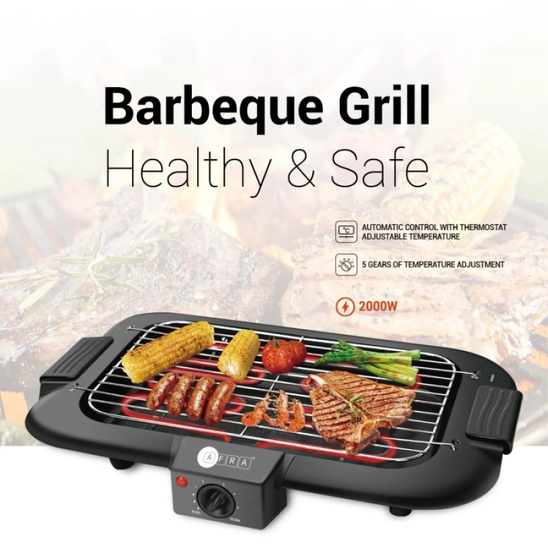 AFRA Electric Barbeque Grill, 2000W, Indoor And Outdoor, Thermostat Control, Overheat Protection, Portable, Smoke-Free, G-MARK, ESMA, ROHS, And CB Certified, AF-2000BGBK, 2 Years Warranty