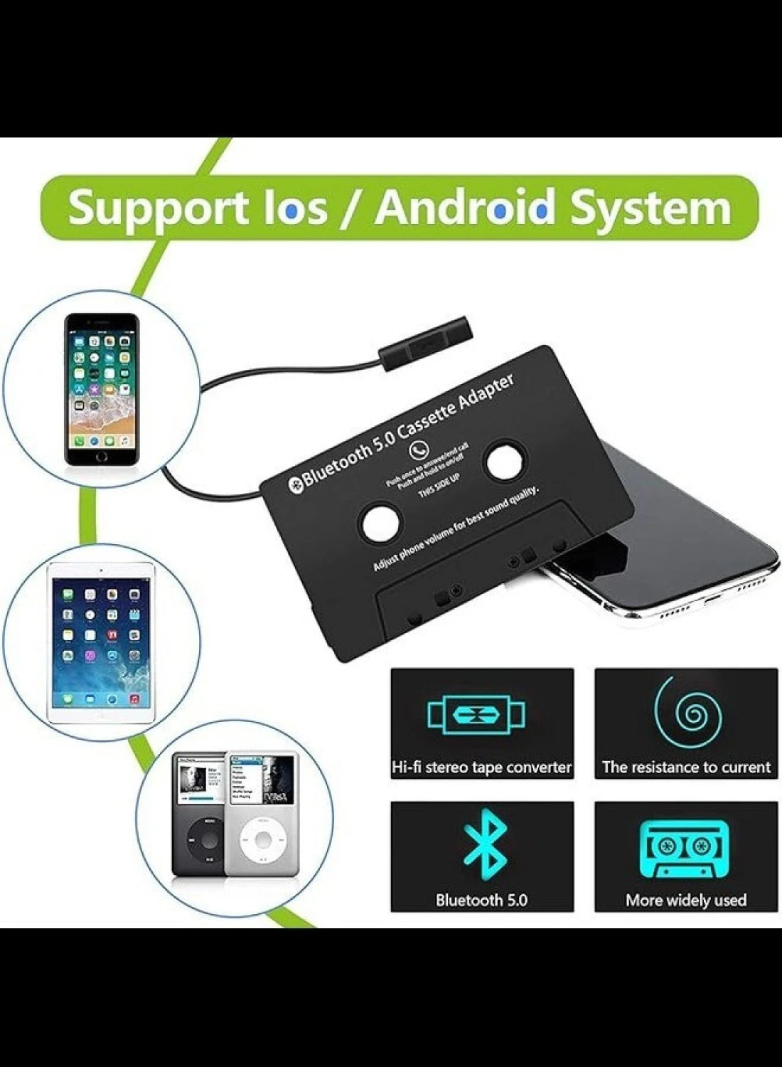• Plug and Play: Simple setup with a 3.5mm jack plug that connects directly to your car's cassette player, requiring no additional installation or tools.