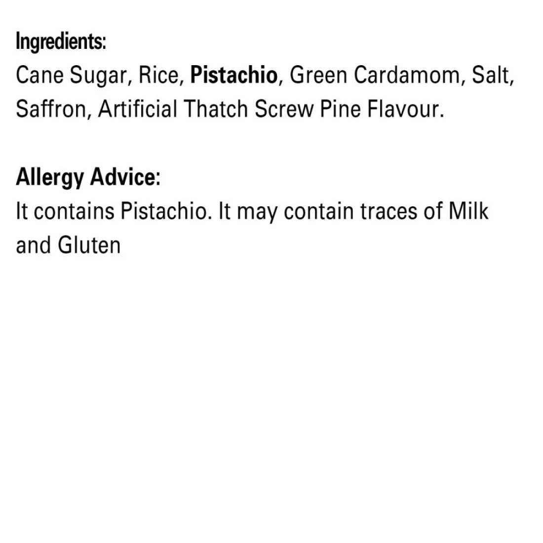 ingredients : قصب السكر، الأرز، الفستق، الهيل الأخضر، الملح، الزعفران، نكهة الصنوبر الصناعية